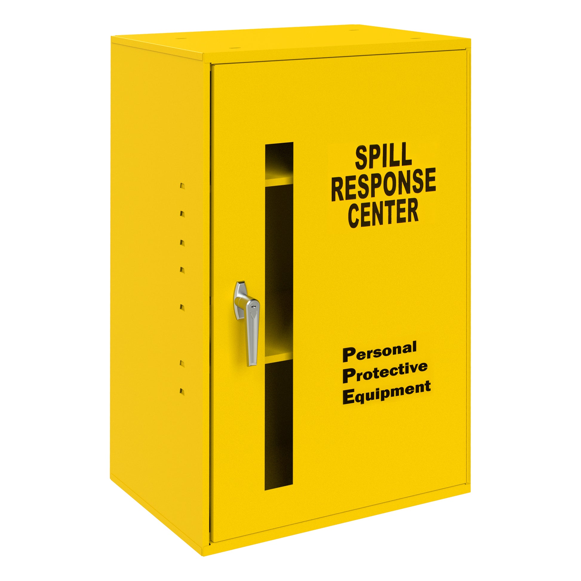 Spill Control/Respirator Cabinet, 2 Shelves, Full Length Plexiglass Window, Key Hole Slots For Wall Mounting, Locking handle with keys, Rust And Acid Resistant, Yellow