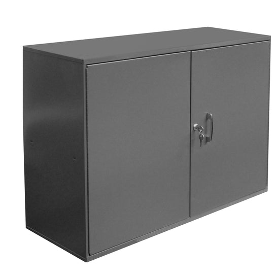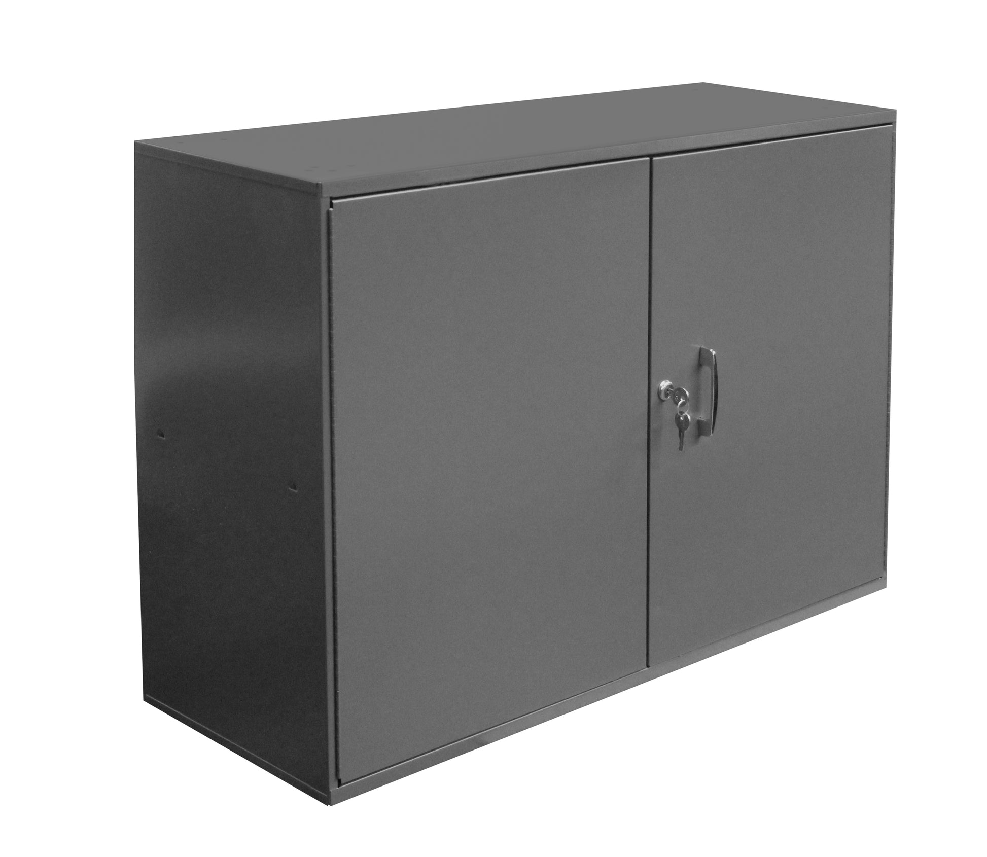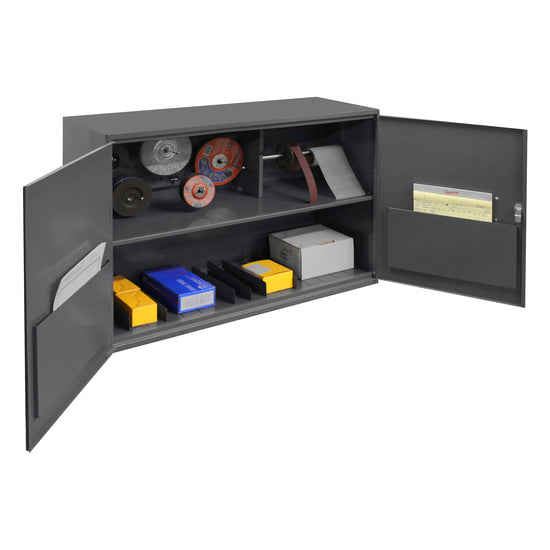 Wall Mounted Aerosol Storage Cabinet, 20 Gauge, 2 Shelves, 2 Doors, 2 Pockets On Doors, Pre-Installed Lock, Key Hole Slots For Wall Mounting, Gray