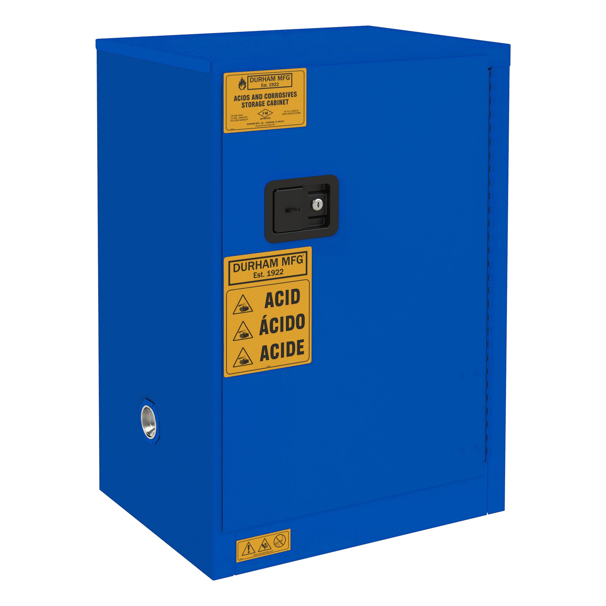 FM Approved, Corrosive Storage Cabinet, 12 Gallon, 1 Door, Manual Close, 1 Shelf, 2 Plastic Trays, Blue