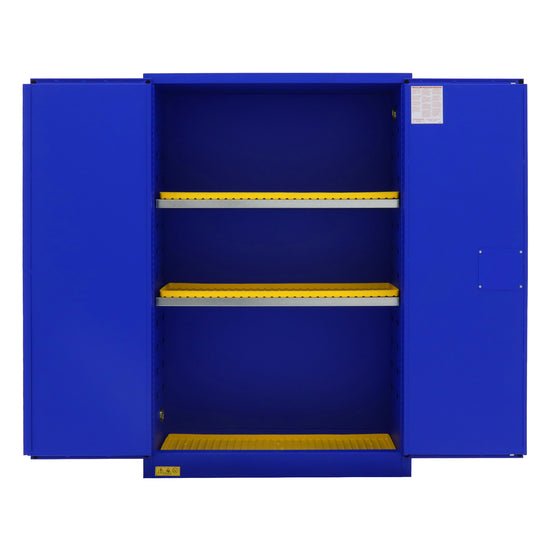 FM Approved, Corrosive Storage Cabinet, 45 Gallon, 2 Doors, Manual Close, 2 Shelves, 3 Plastic Trays, Blue