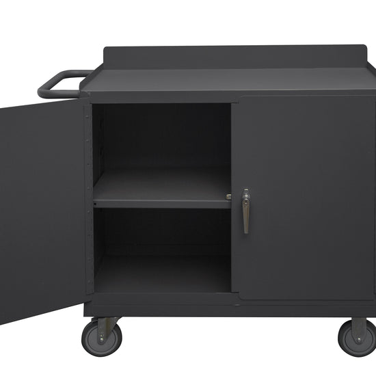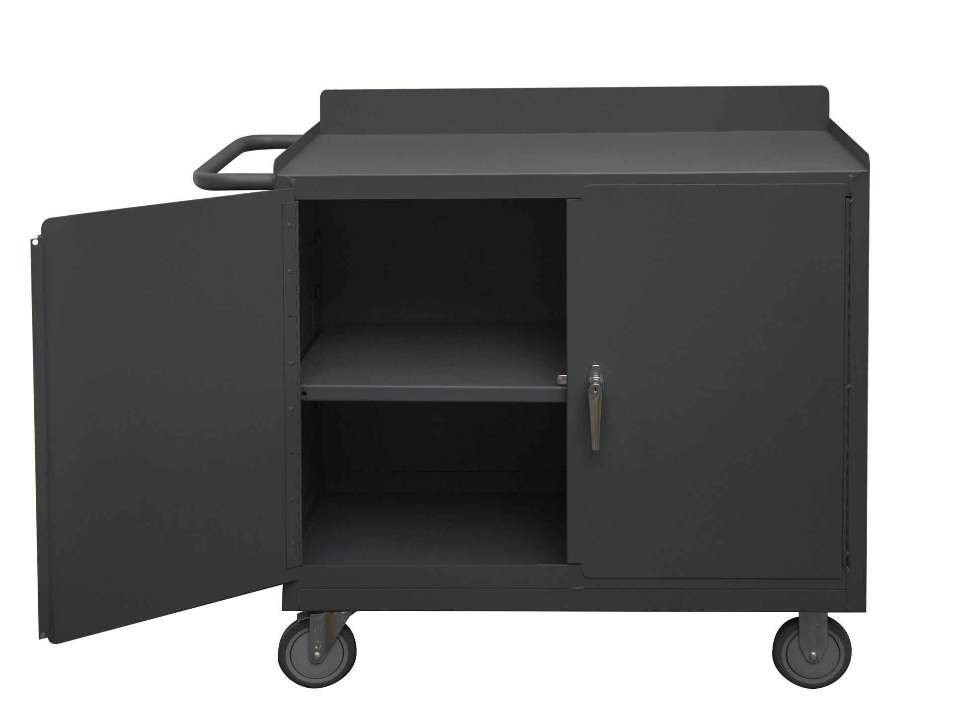 Mobile Bench Cabinet with 5" X 1-1/4" Polyurethane Casters - (2) Rigid, (2) Swivel, 1 Shelf, 2 Doors, Lockable, Tubular Push Handle, Gray