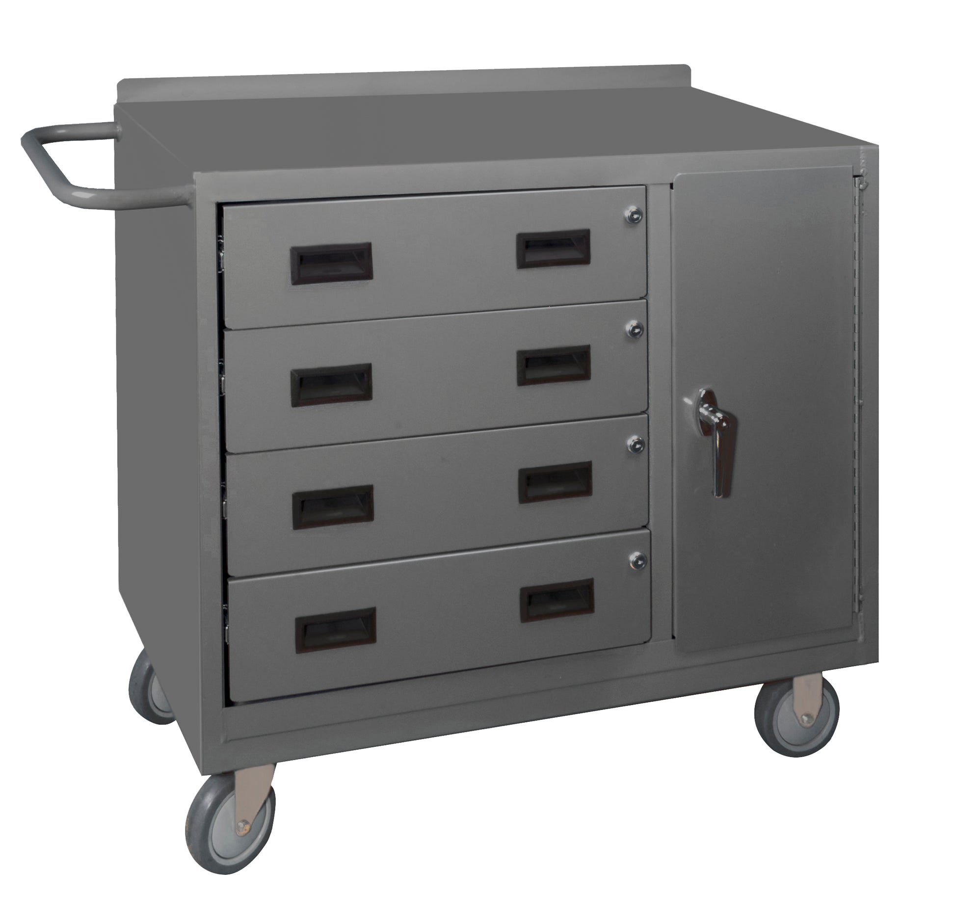 Mobile Bench Cabinet with 5" x 1-1/4" Polyurethane Casters - (2) Rigid, (2) Swivel, 1 Shelf in Storage Area, 1 Side Door, 4 Drawers, Lockable, Tubular Push Handle, Gray