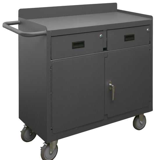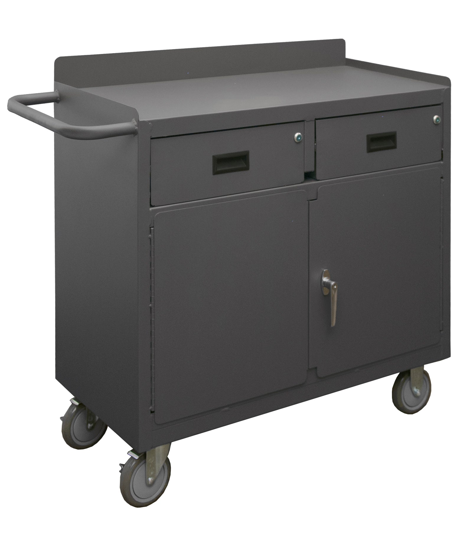 Mobile Bench Cabinet with 5" x 1-1/4" Polyurethane Casters - (2) Rigid, (2) Swivel, 1 Adjustable Shelf, 2 Doors, 2 Drawers, Lockable, Tubular Push Handle, Gray