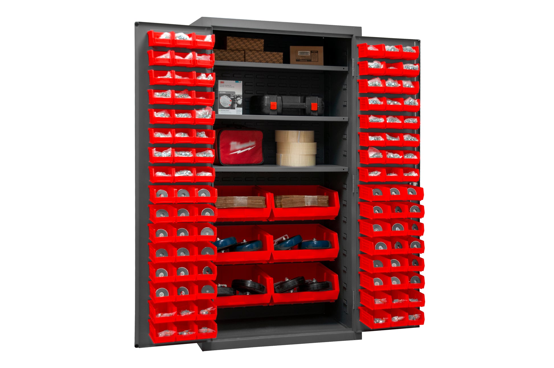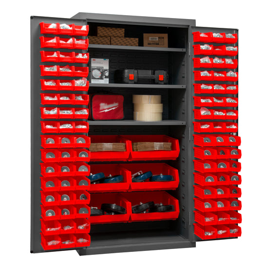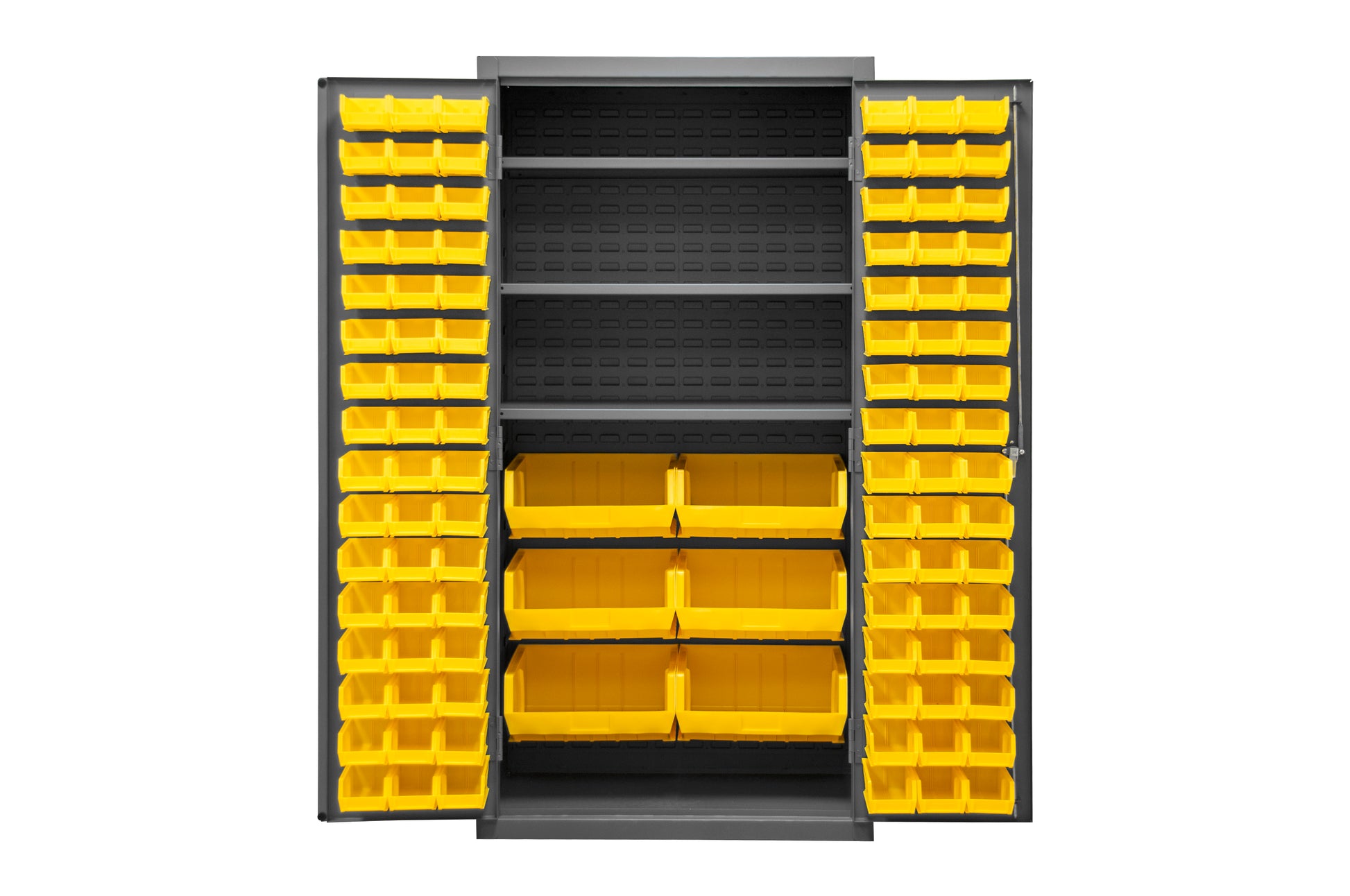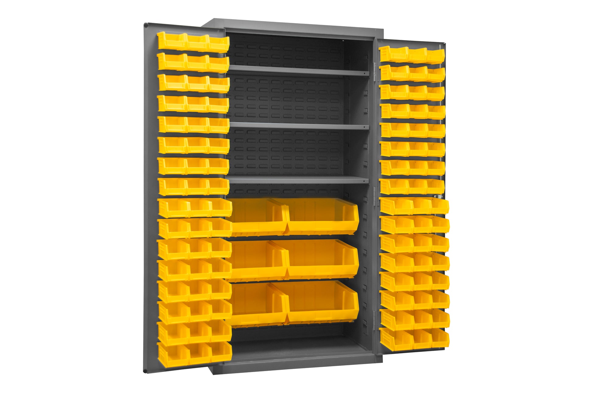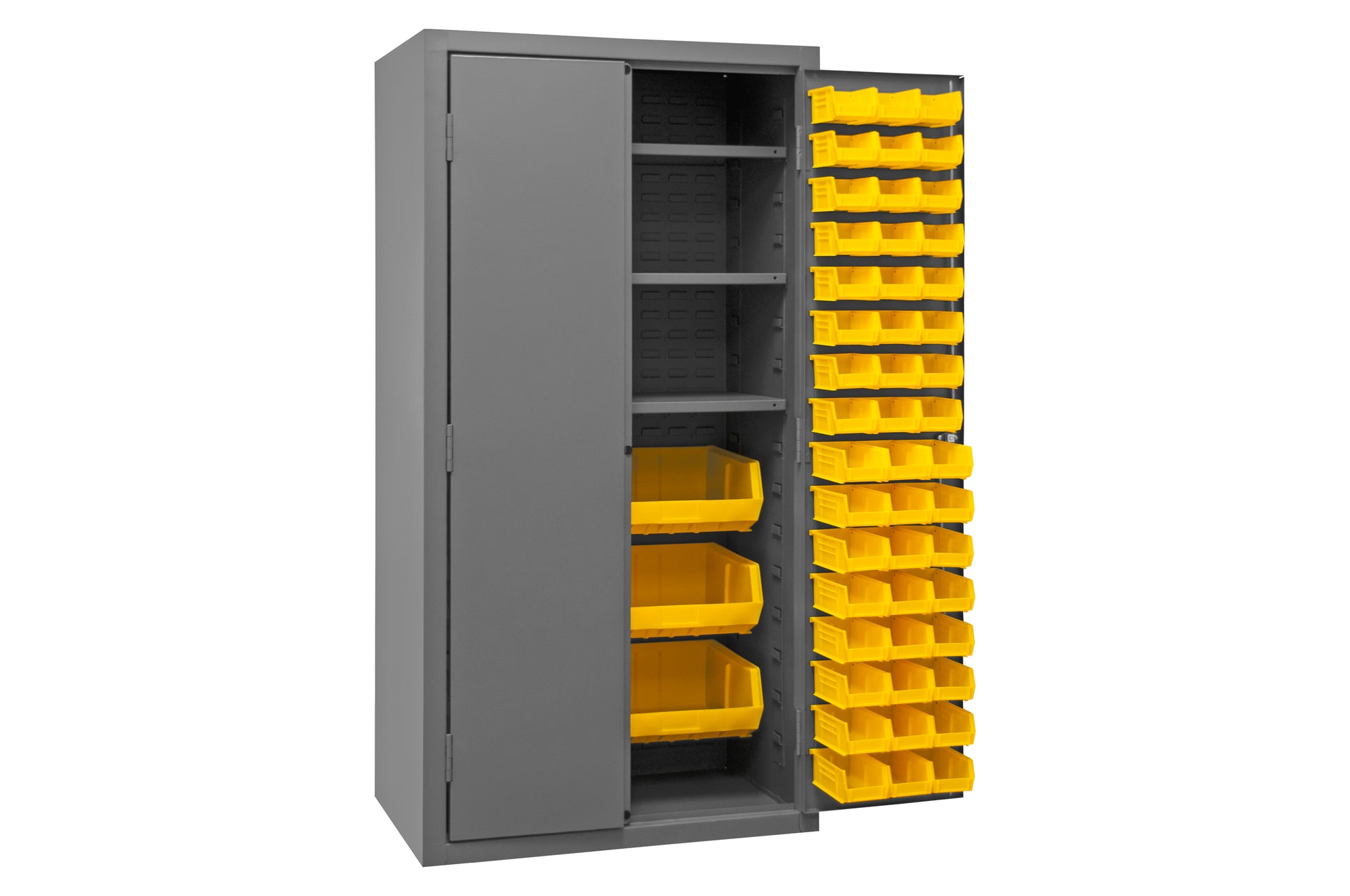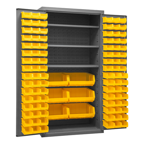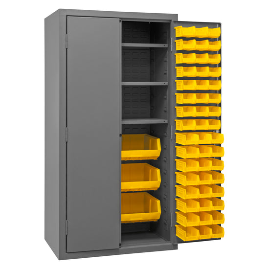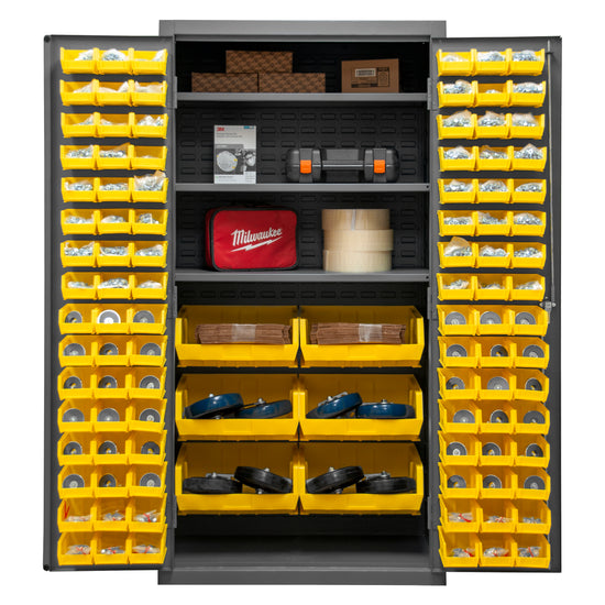 Cabinet, 16 Gauge, 36 x 24 x 72, 3 Adjustable Shelves, 102 Yellow Bins, Flush Doors with Louvered Panel, Lockable, Chrome Handle with Keys, Gray