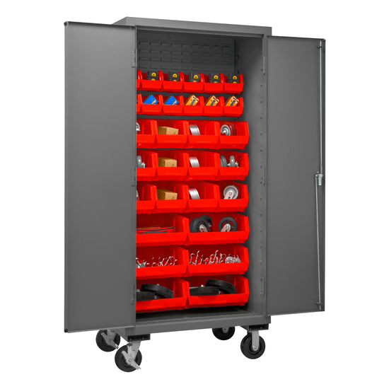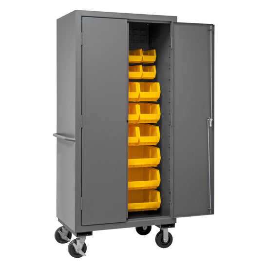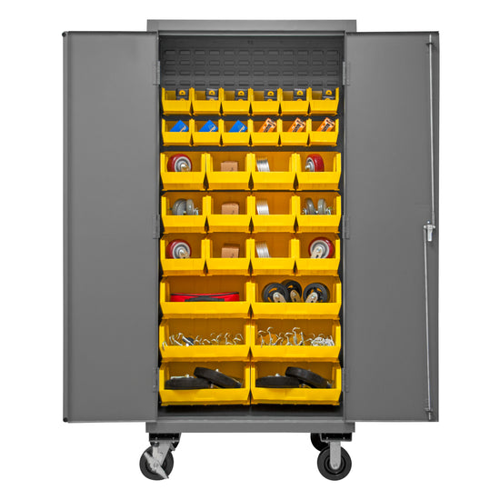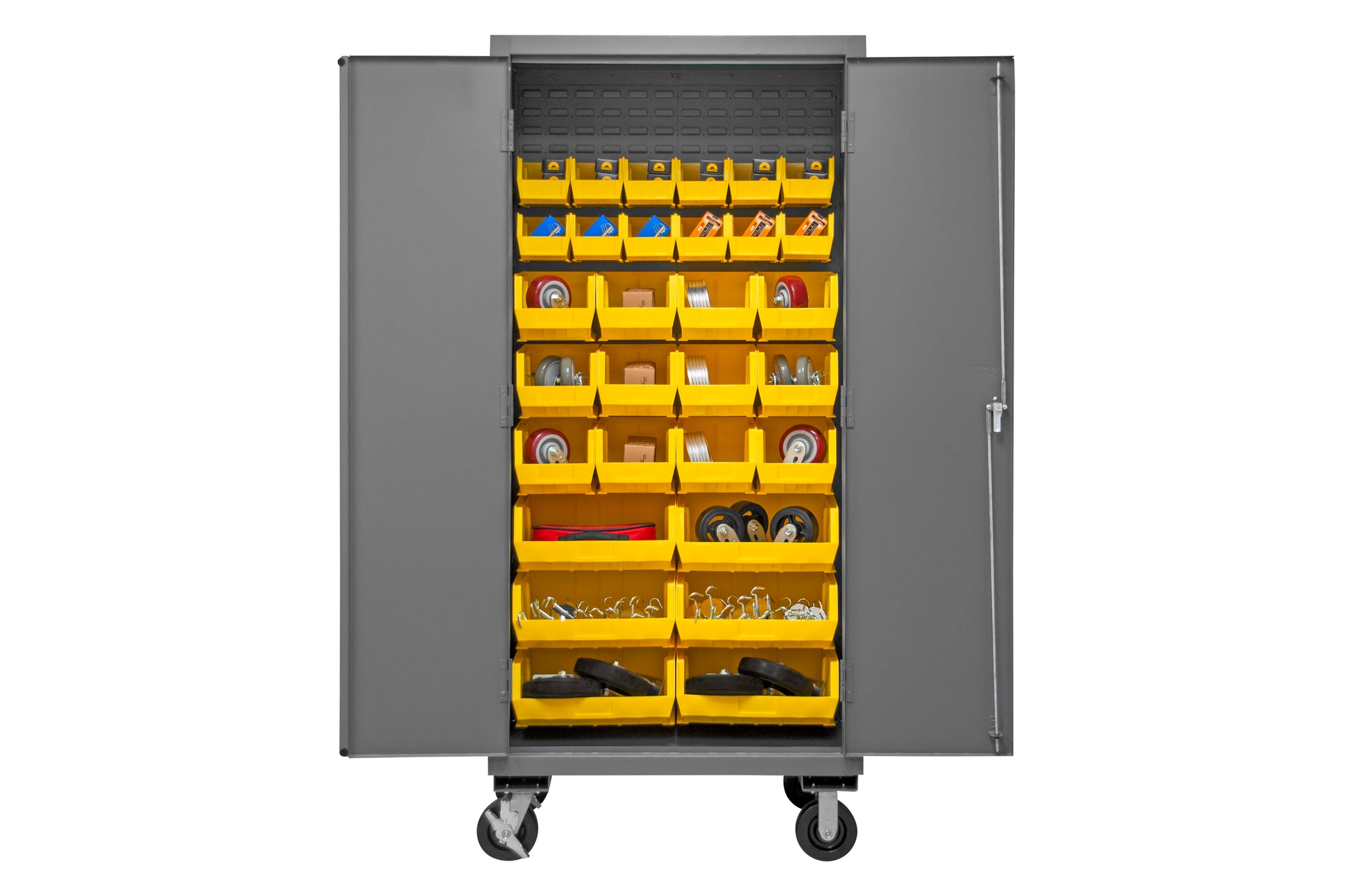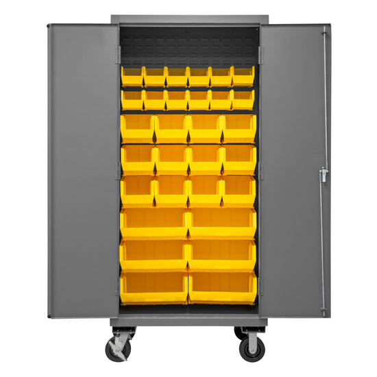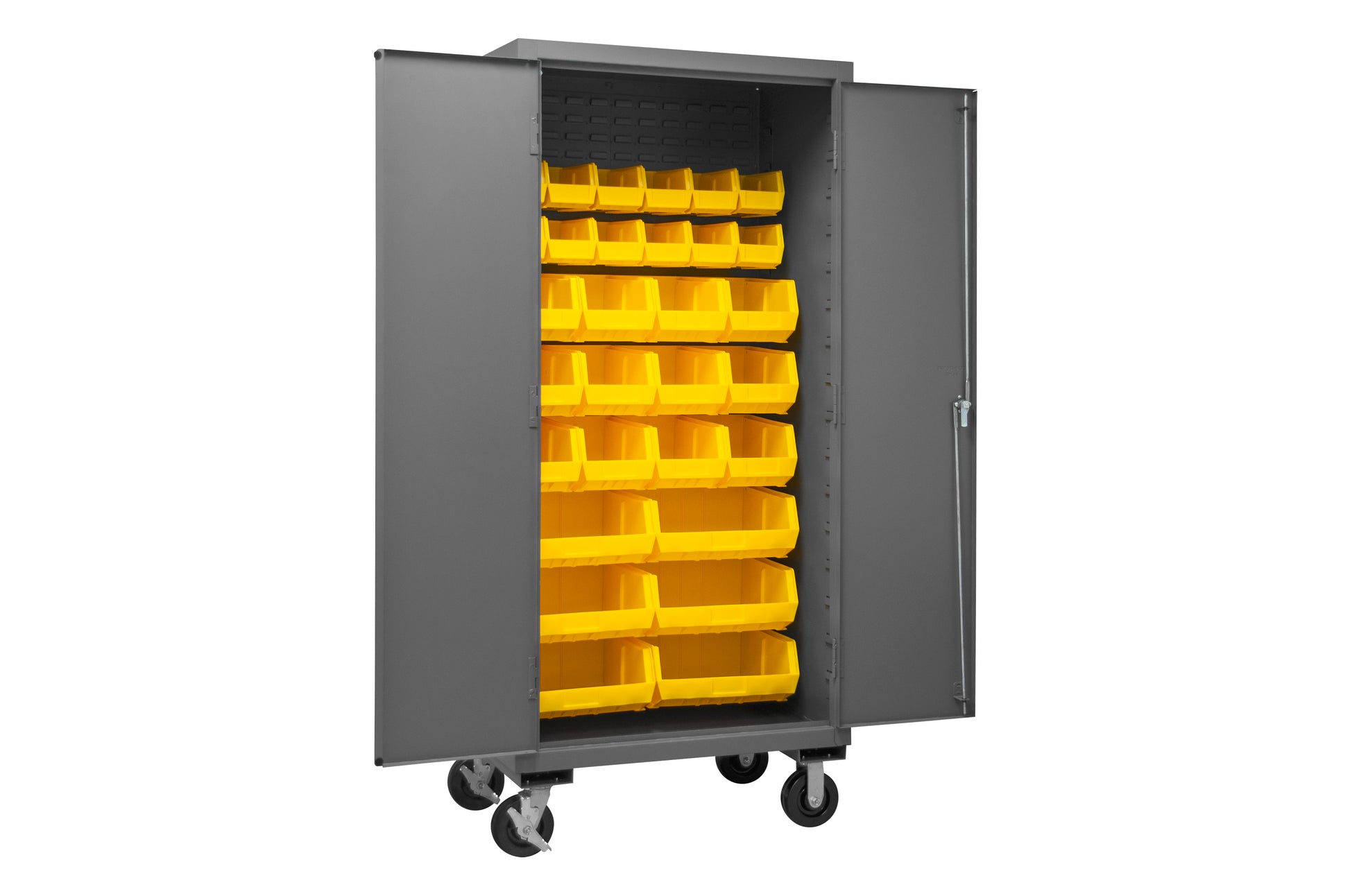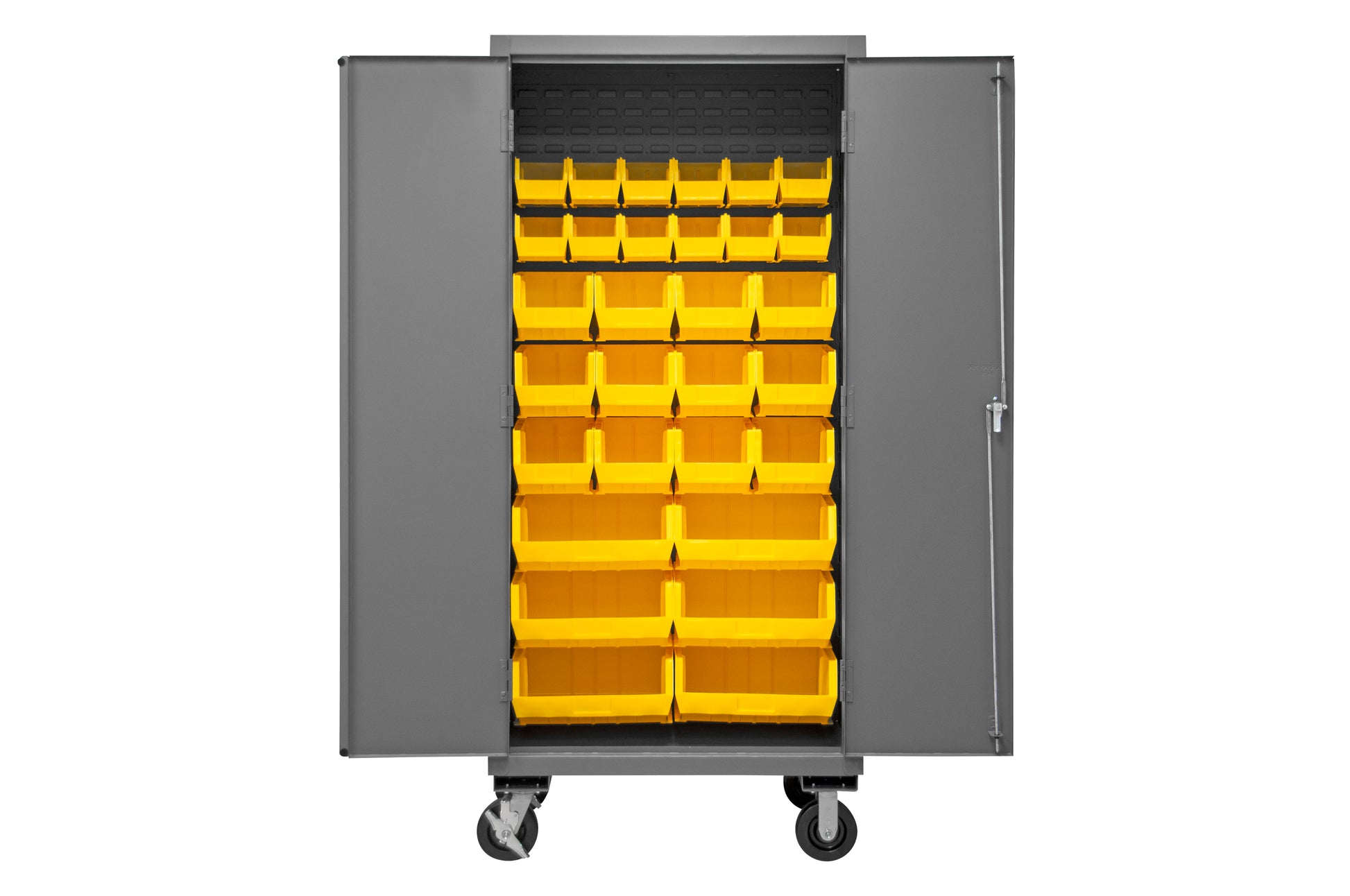 Mobile Cabinet, 16 Gauge, 36 x 24 x 81, 30 Yellow Bins, Flush Doors, 6" x 2" Phenolic Casters - (2) Rigid, (2) Swivel, Lockable, Chrome Handle with Keys, Gray
