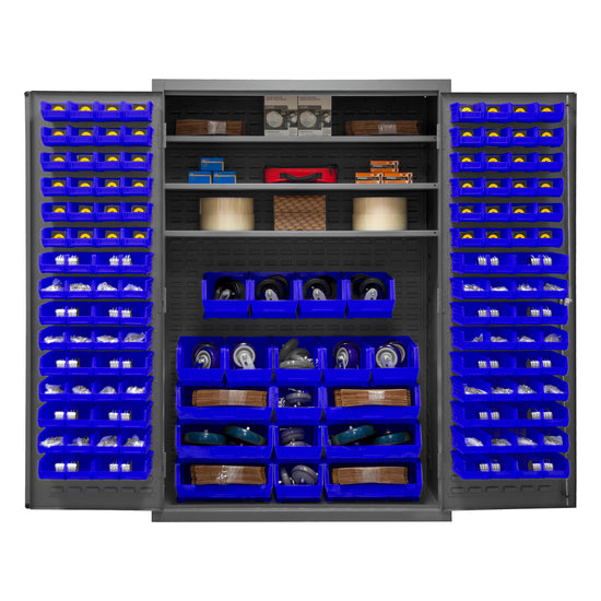 Cabinet, 16 Gauge, 48 x 24 x 72, 3 Adjustable Shelves, 138 Blue Bins, Recessed Doors with Louvered Panel, Lockable, Chrome Handle with Keys, Gray
