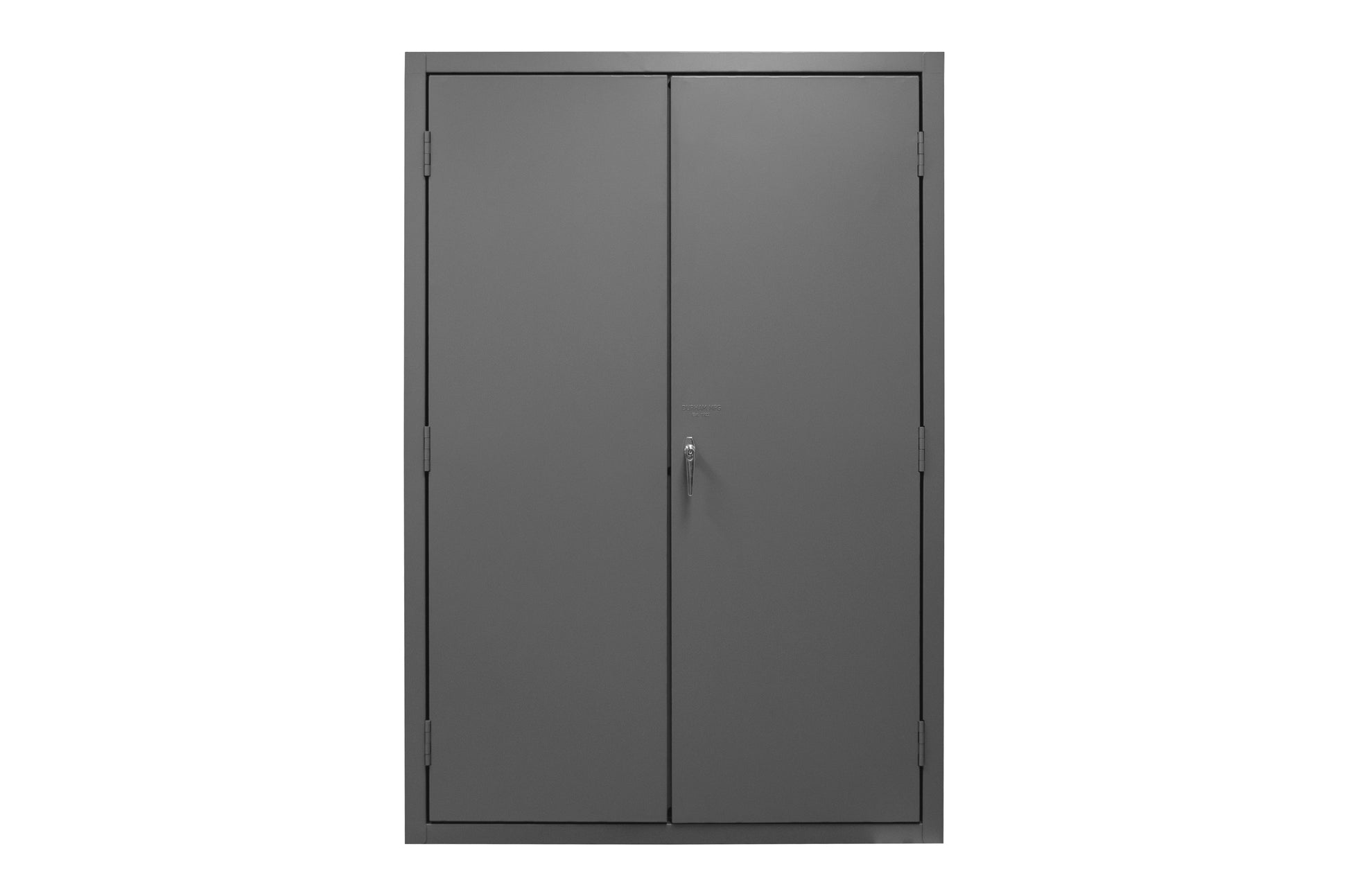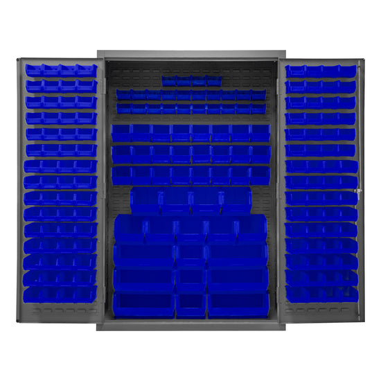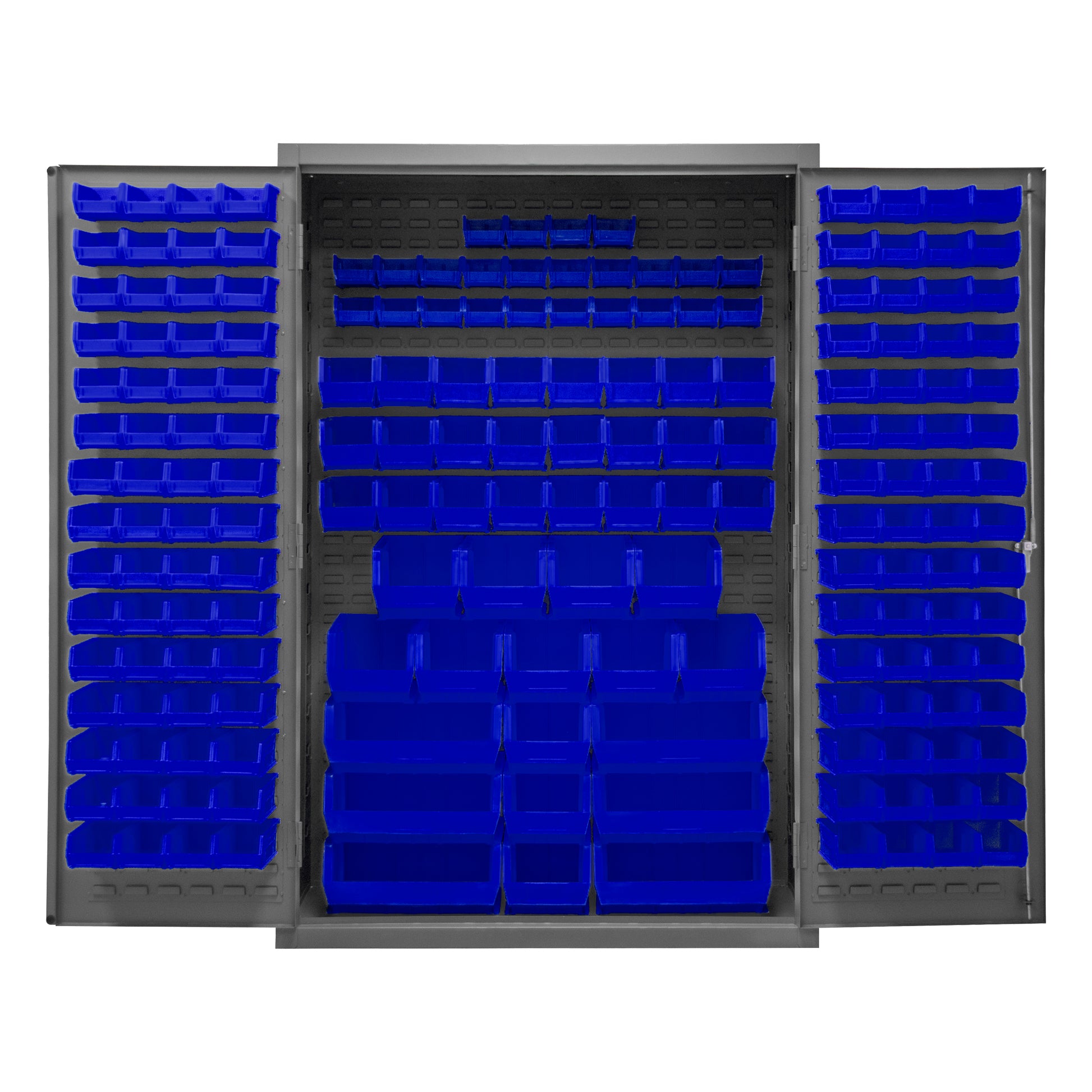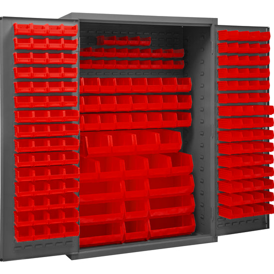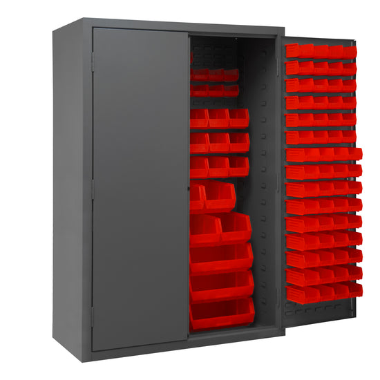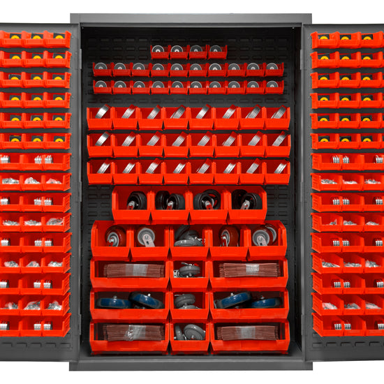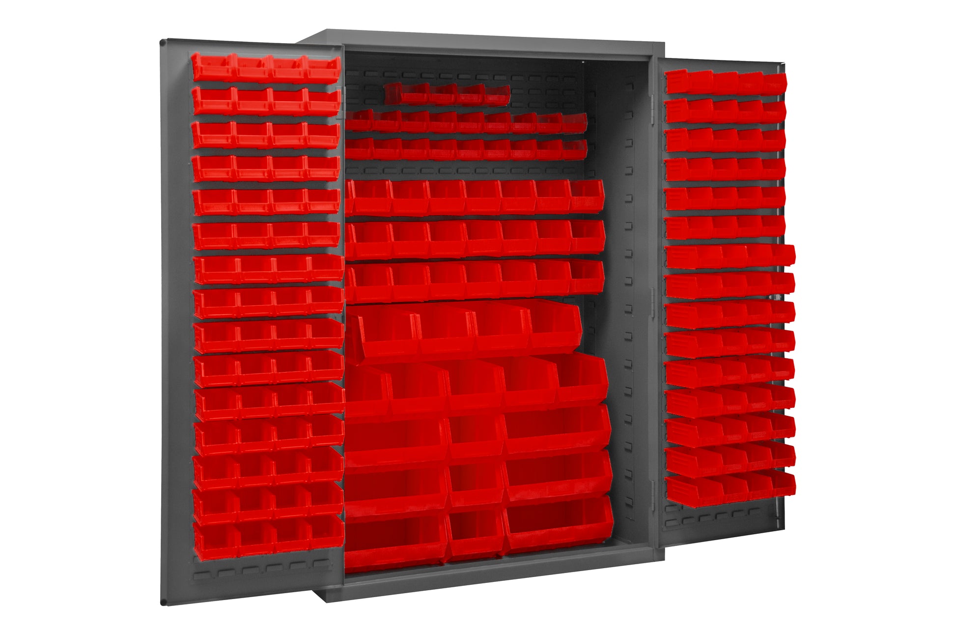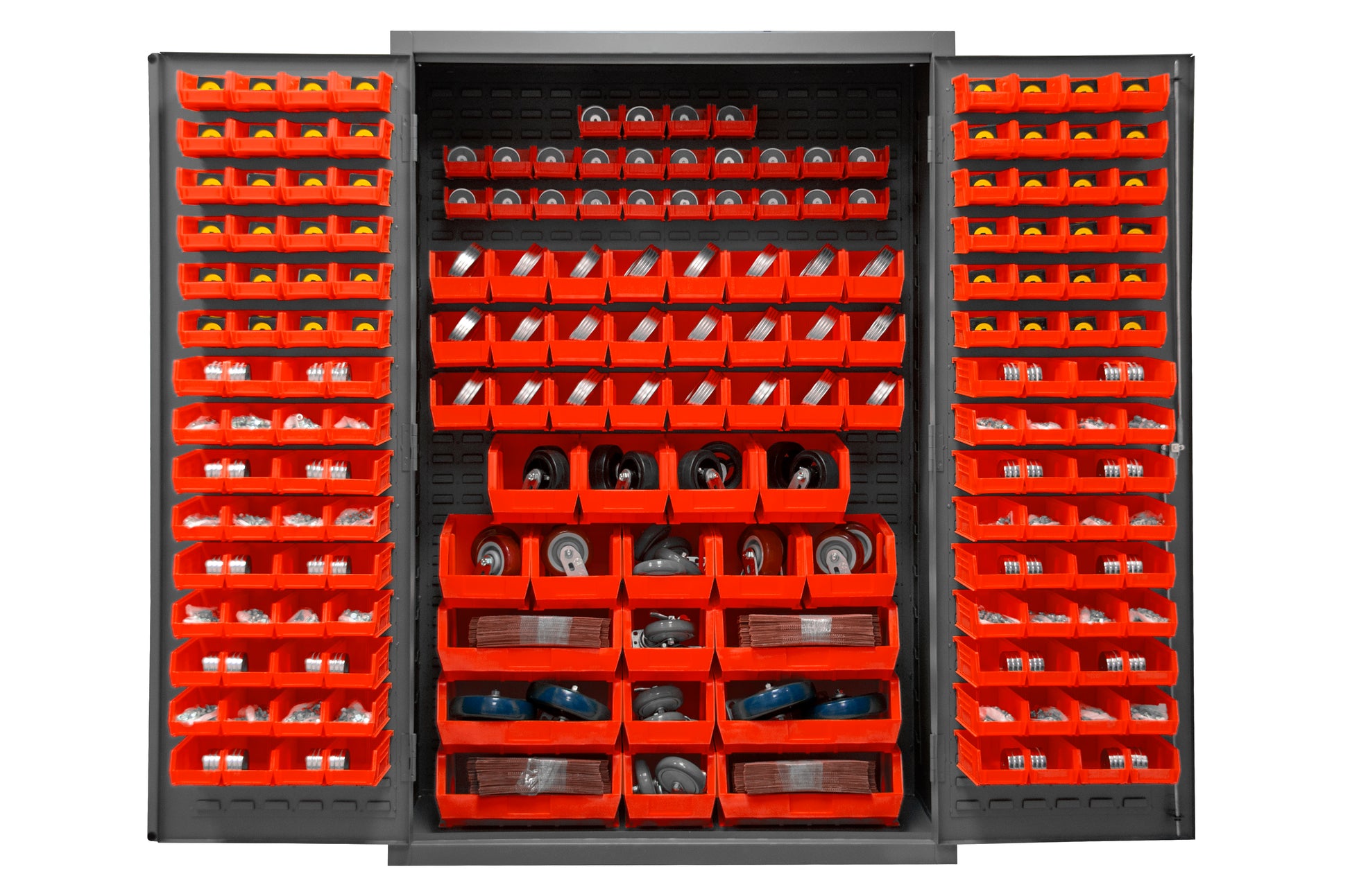 Cabinet, 16 Gauge, 48 x 24 x 72, 186 Red Bins, Recessed Doors with Louvered Panel, Lockable, Chrome Handle with Keys, Gray