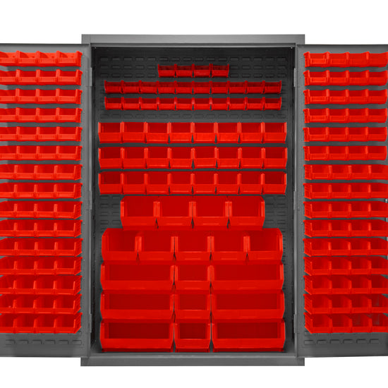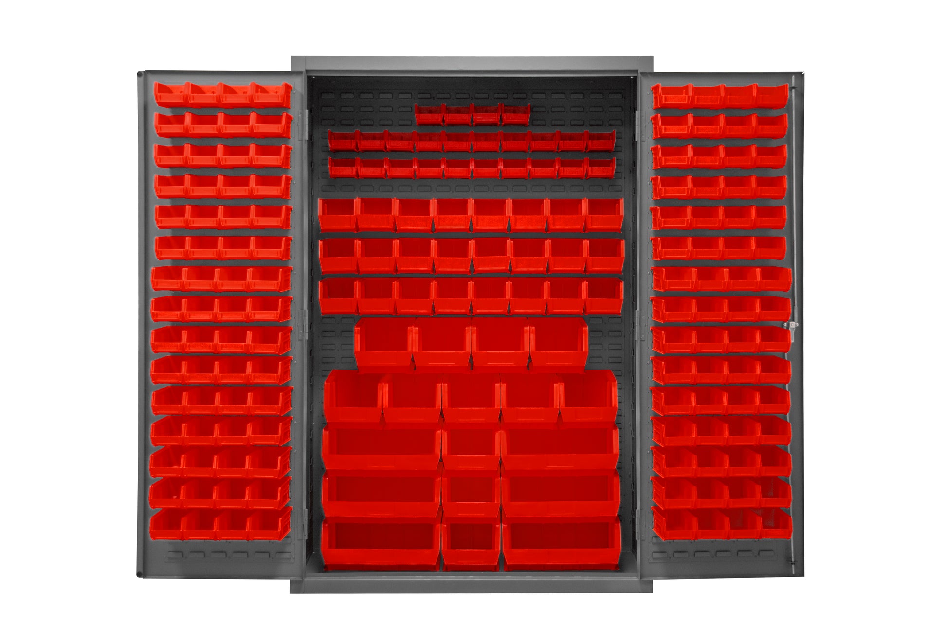 Cabinet, 16 Gauge, 48 x 24 x 72, 186 Yellow Bins, Recessed Doors with Louvered Panel, Lockable, Chrome Handle with Keys, Gray