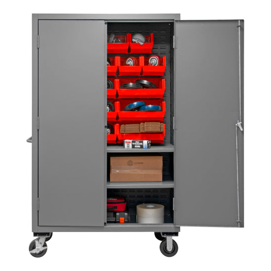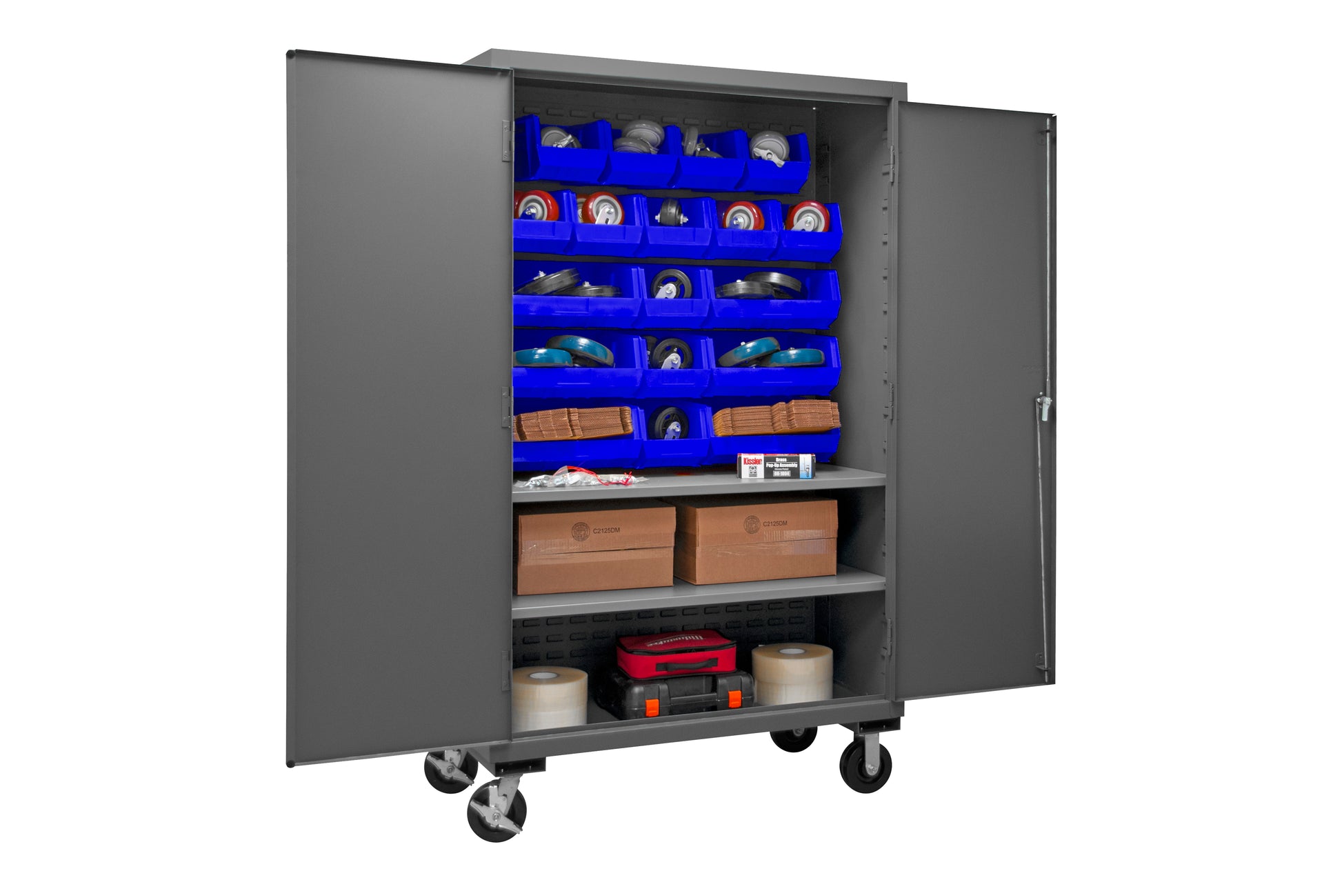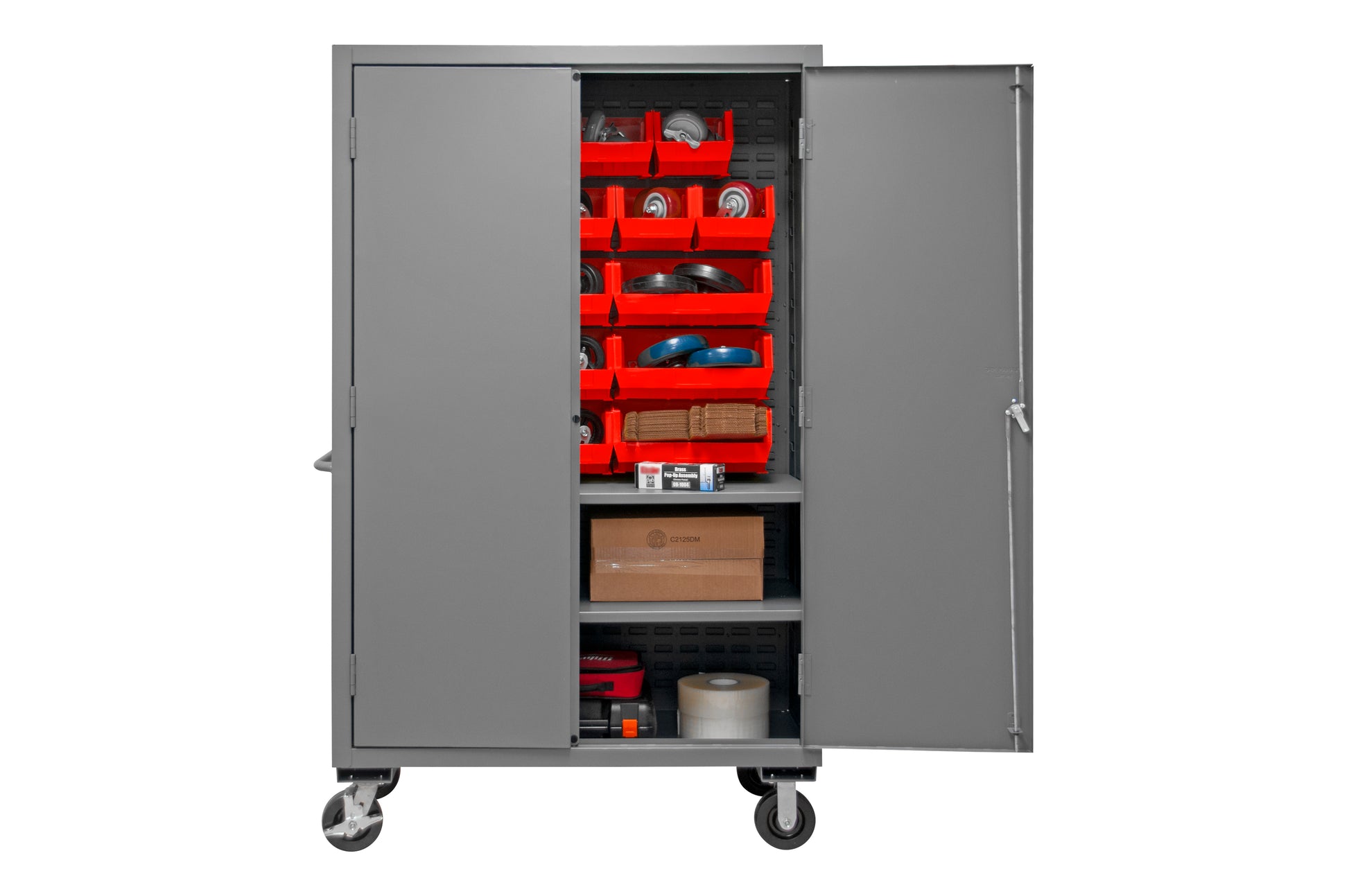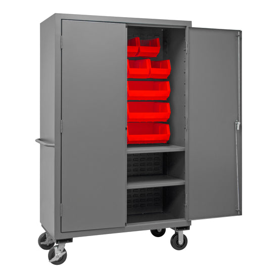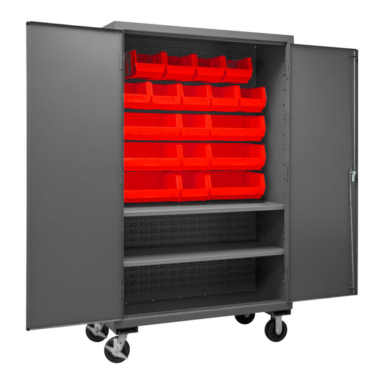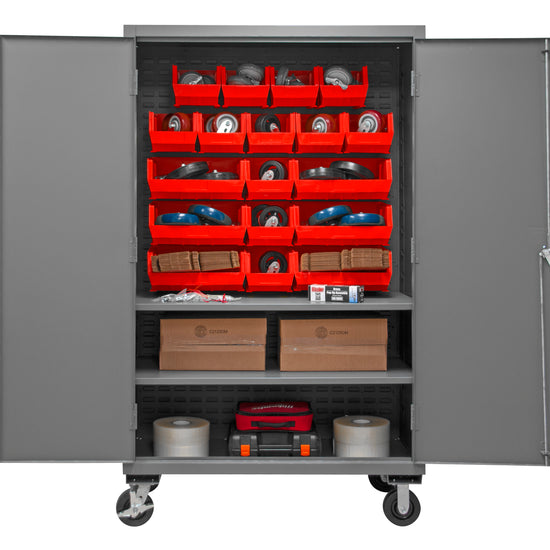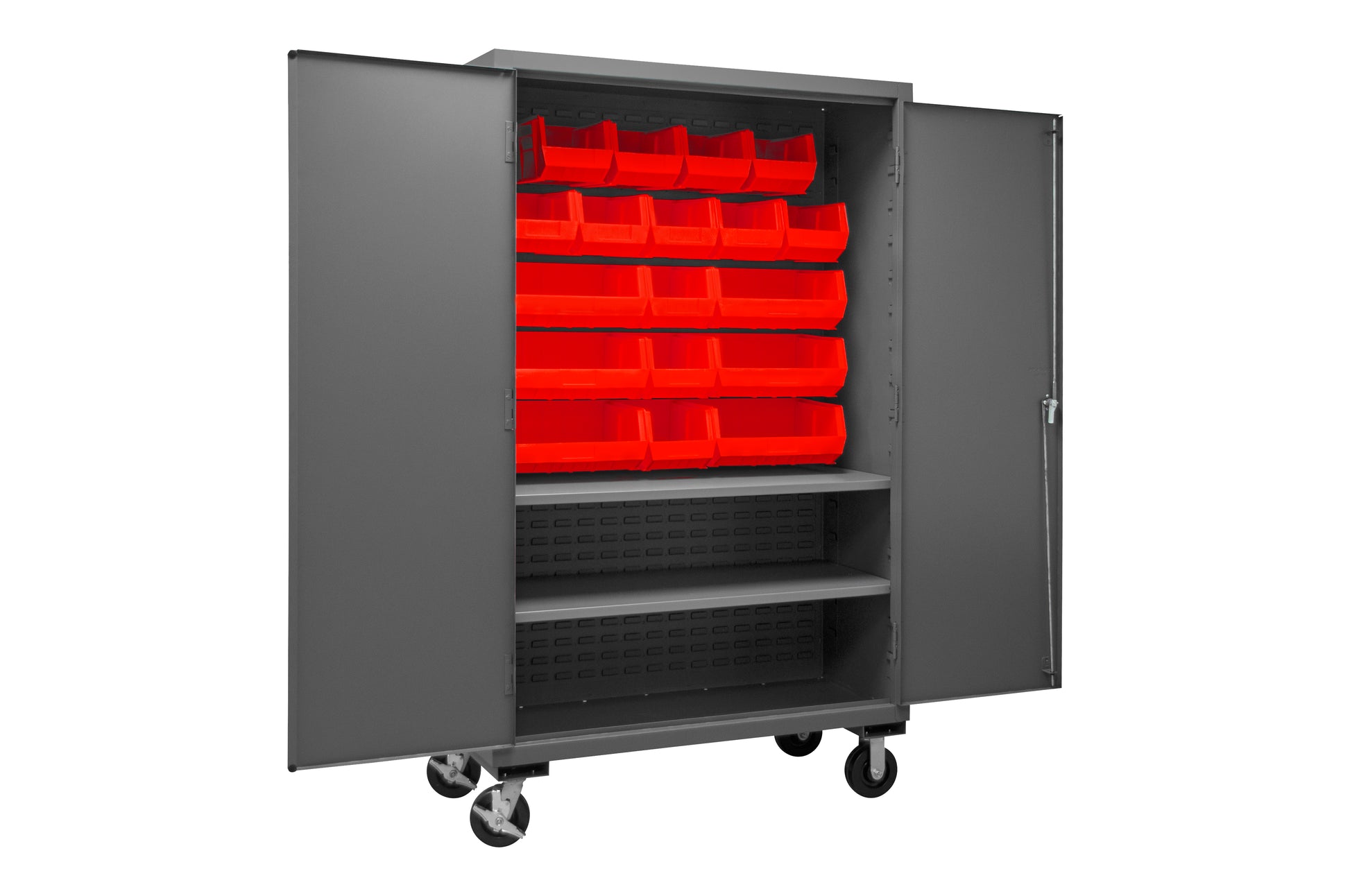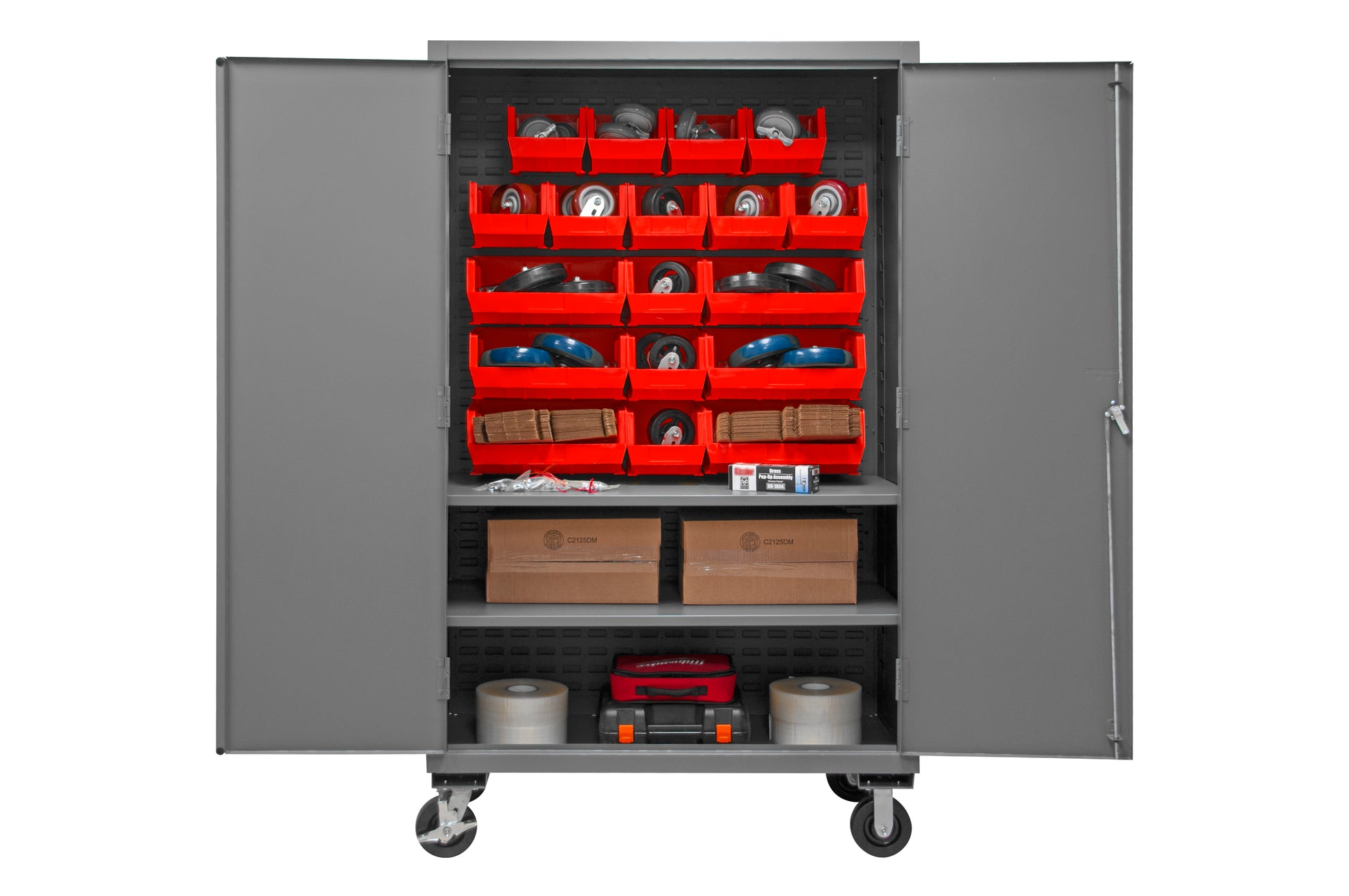 Mobile Cabinet, 16 Gauge, 48 x 24 x 81, 2 Adjustable Shelves, 18 Red Bins, Recessed Doors, 6" x 2" Phenolic Casters - (2) Rigid, (2) Swivel, Lockable, Chrome Handle with Keys, Gray