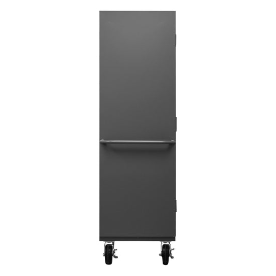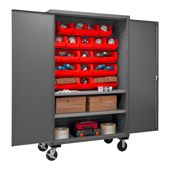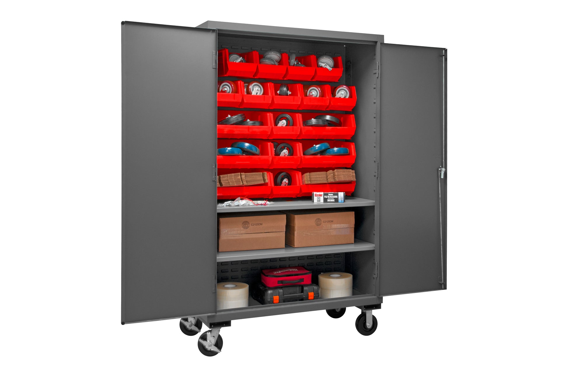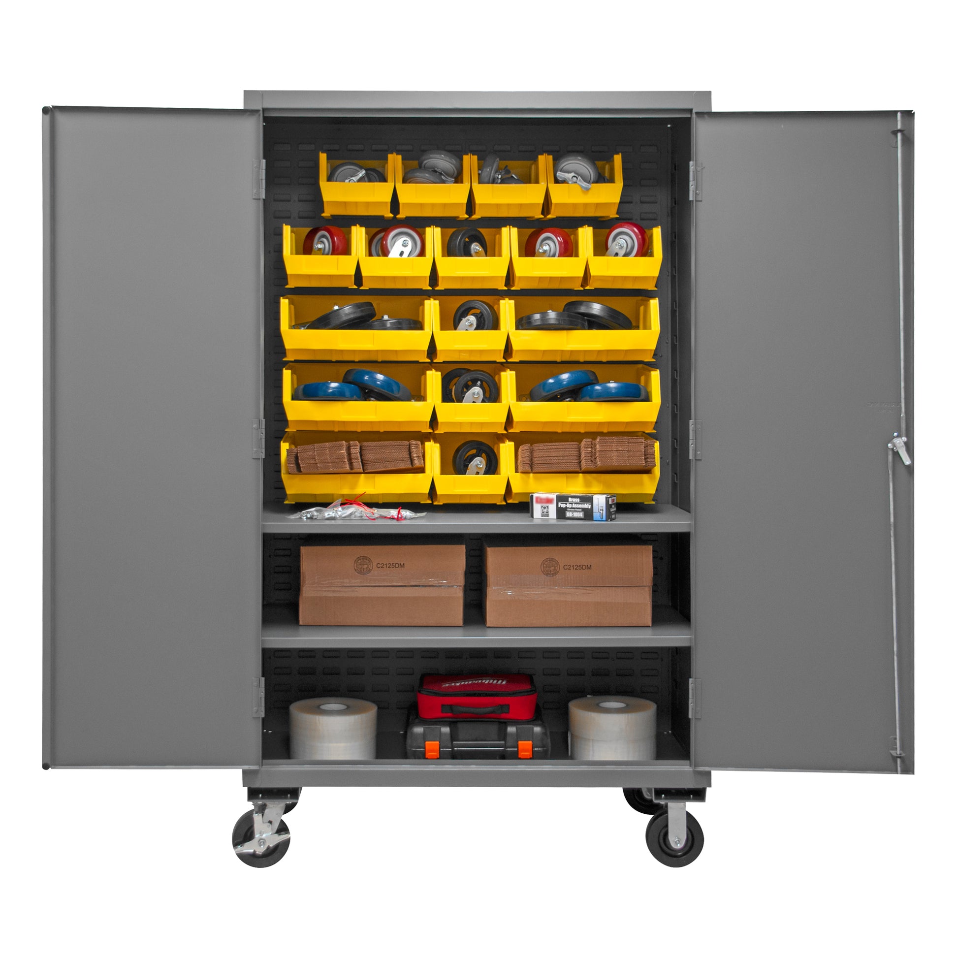 Mobile Cabinet, 16 Gauge, 48 x 24 x 81, 2 Adjustable Shelves, 18 Yellow Bins, Recessed Doors, 6" x 2" Phenolic Casters - (2) Rigid, (2) Swivel, Lockable, Chrome Handle with Keys, Gray