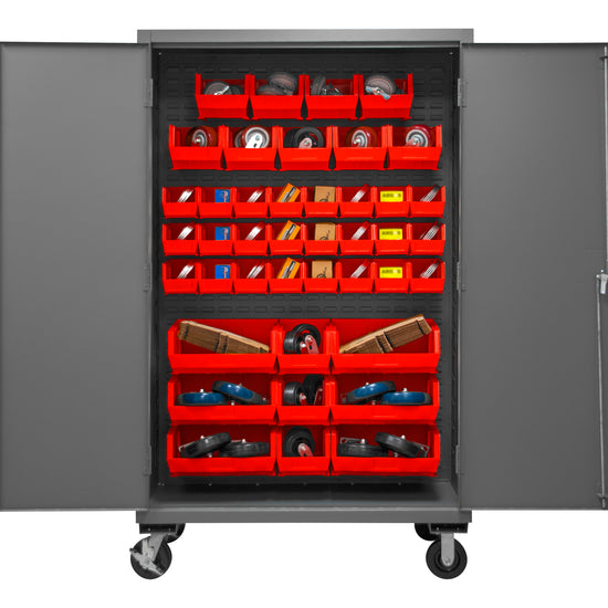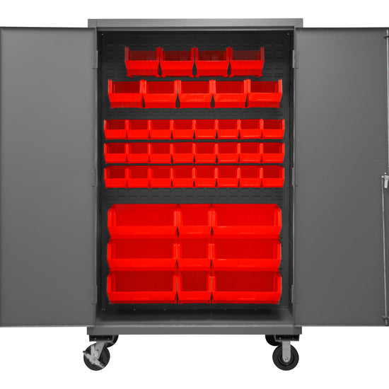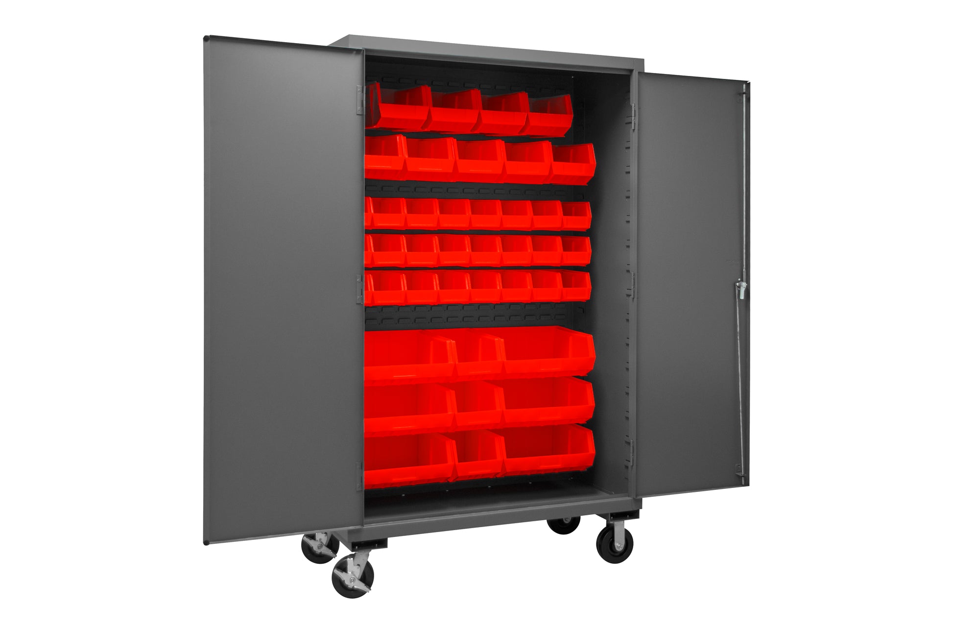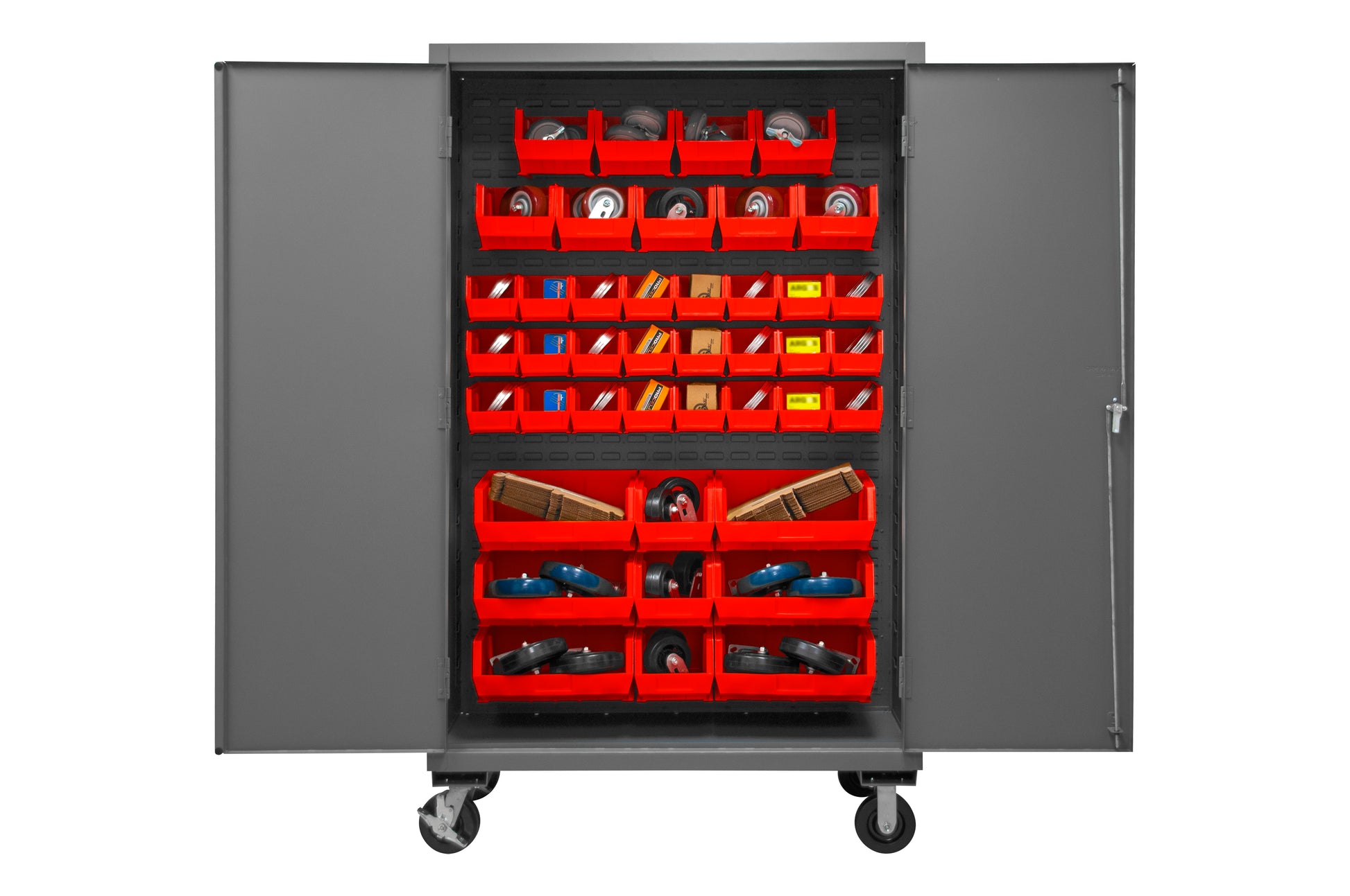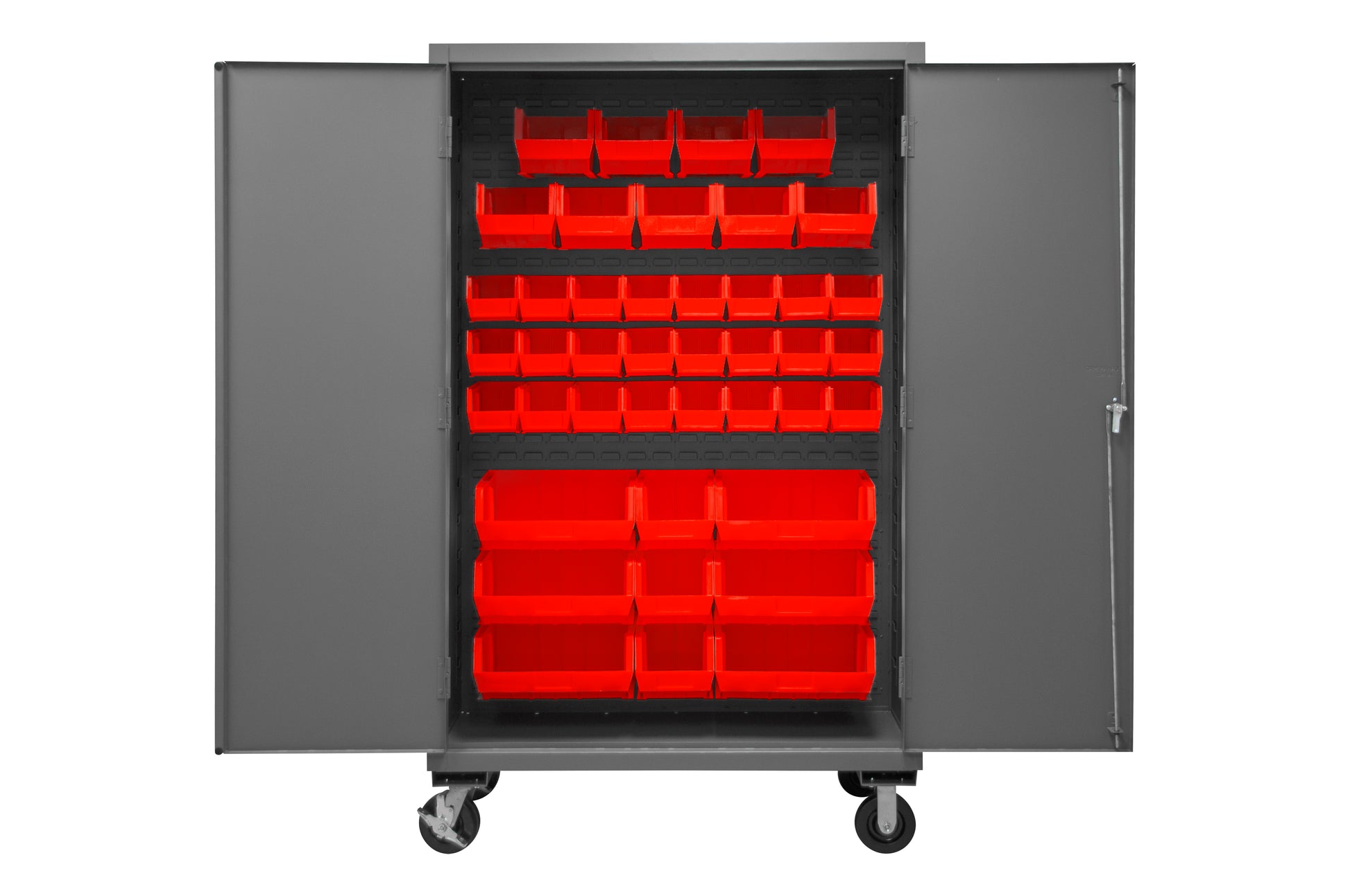 Mobile Cabinet, 16 Gauge, 48 x 24 x 81, 42 Red Bins, Flush Doors, 6" x 2" Phenolic Casters - (2) Rigid, (2) Swivel, Lockable, Chrome Handle with Keys, Gray