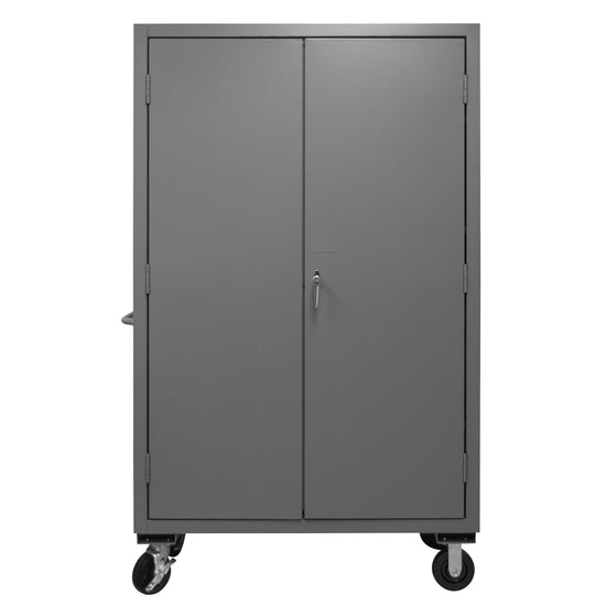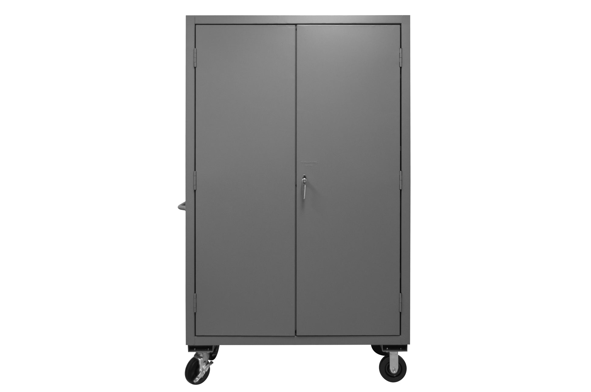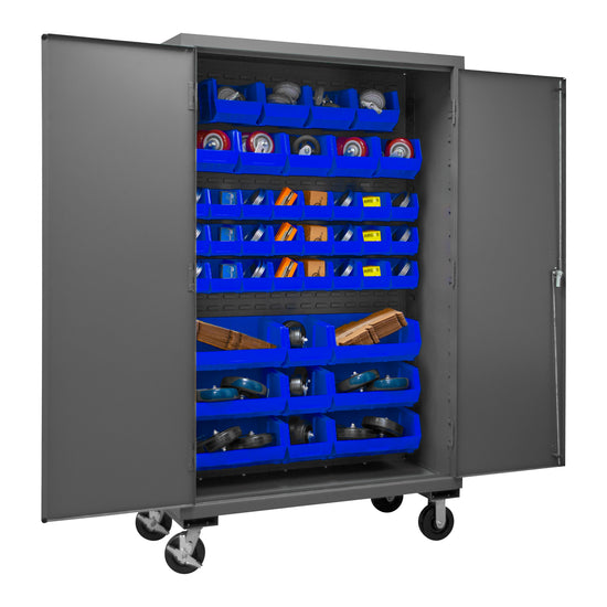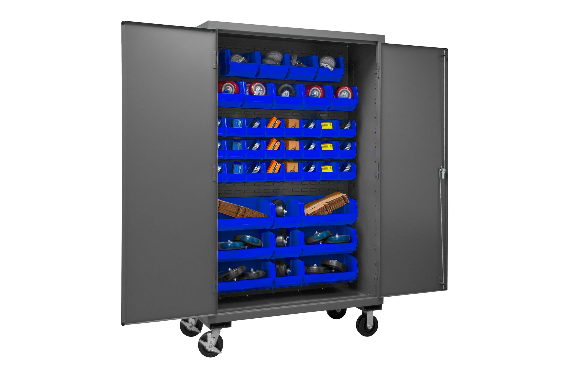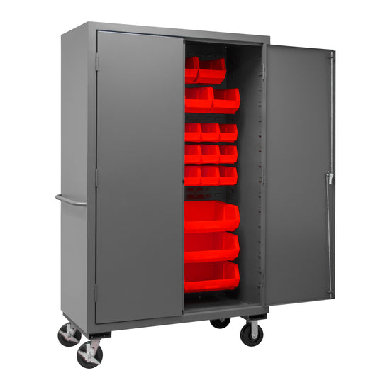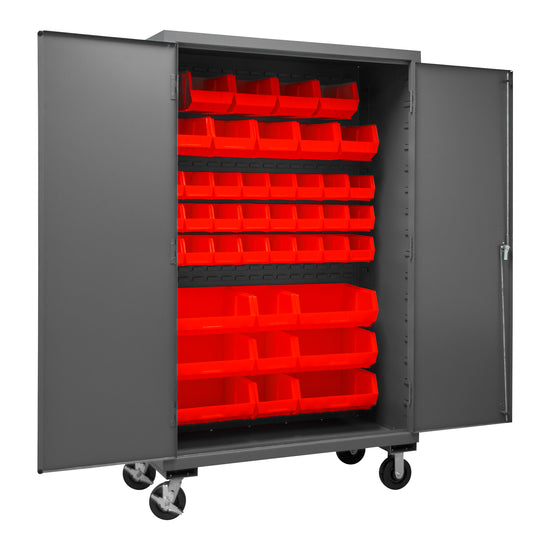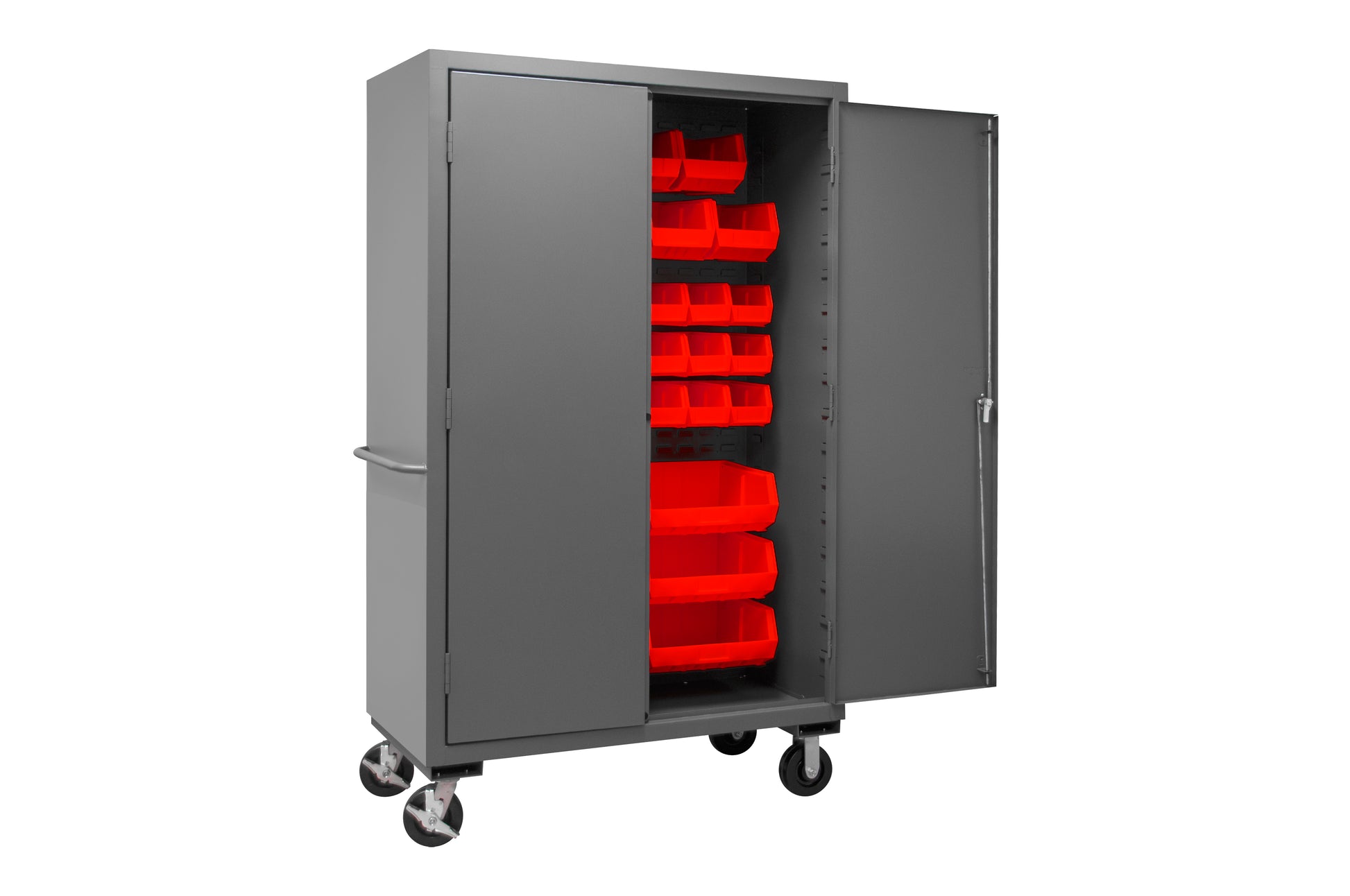 Mobile Cabinet, 16 Gauge, 48 x 24 x 81, 42 Red Bins, Flush Doors, 6" x 2" Phenolic Casters - (2) Rigid, (2) Swivel, Lockable, Chrome Handle with Keys, Gray