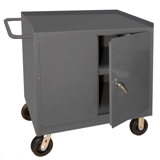 Mobile Bench Cabinet with 6" x 2" Phenolic Bolt-On Casters - (2) Rigid, (2) Swivel, 1 Shelf, 2 Doors, Steel Top Surface with Back Stop, Tubular Push Handle, Gray