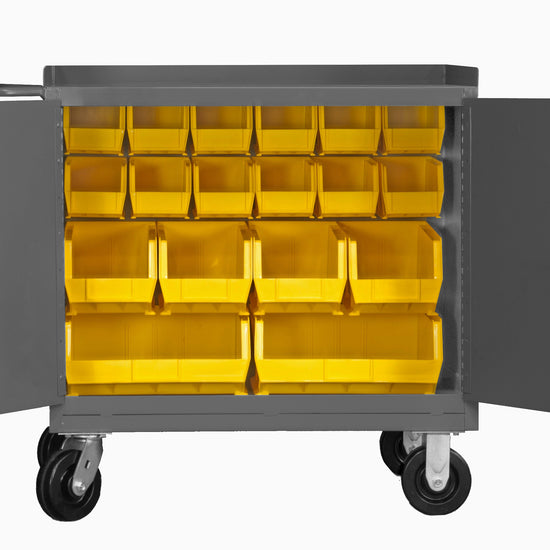Mobile Bench Cabinet with 6" x 2" Phenolic Bolt-On Casters - (2) Rigid, (2) Swivel, 18 Yellow Hook-On-Bins, 2 Doors, Steel Top Surface with Back Stop, Tubular Push Handle, Gray