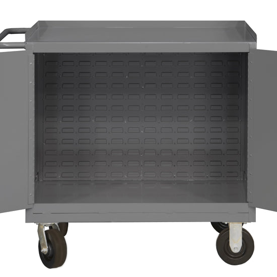 Mobile Bench Cabinet with 6" x 2" Phenolic Bolt-On Casters - (2) Rigid, (2) Swivel, Louvered Panel to Hang Hook-On-Bins, Steel Top Surface with Back Stop, 2 Doors, Tubular Push Handle, Gray