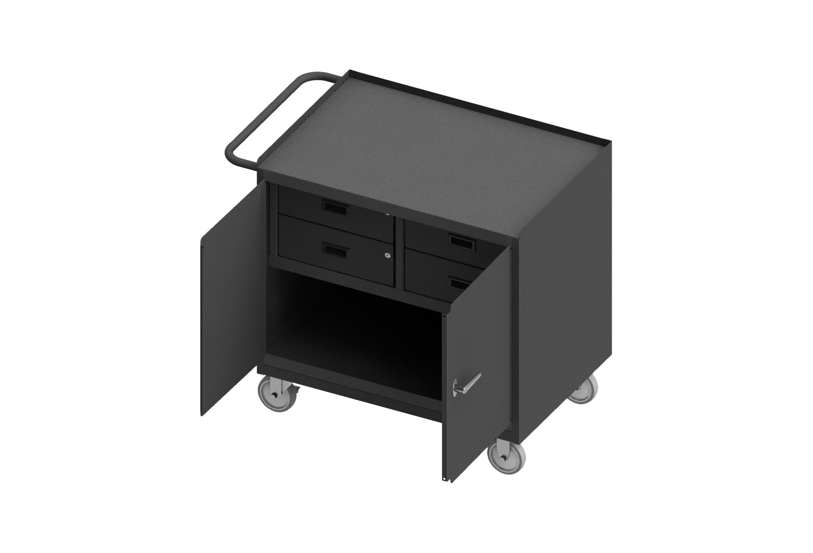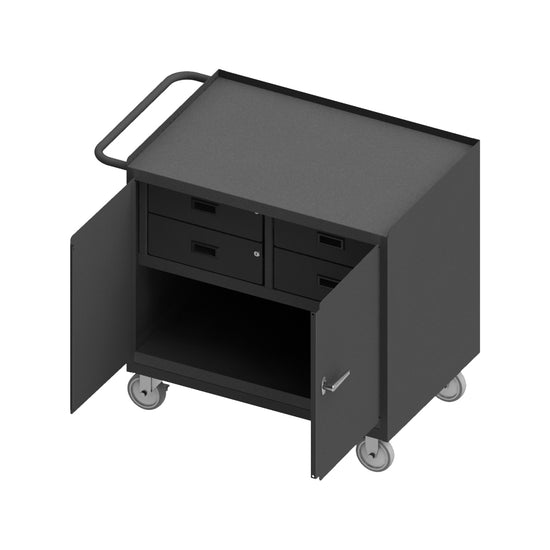 Mobile Bench Cabinet with 5" x 1-1/4" Polyurethane Casters - (2) Rigid, (2) Swivel, 2 Doors, 4 Drawers, Steel Top Surface, Tubular Push Handle, Gray