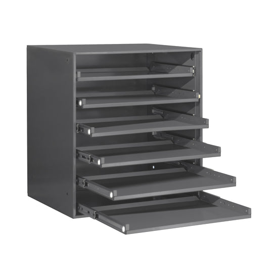 Heavy Duty Bearing Slide Rack, Cold-Rolled Steel, 6 Sliding Compartments, Positive Closure Feature To Keep Trays In, Punched Holes For Installation, Gray