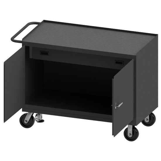 Mobile Bench Cabinet with 6" x 2" Phenolic Casters - (2) Rigid, (2) Swivel, 2 Doors, 1 Drawer, Black Rubber Mat Top Surface, Floor Lock, Tubular Push Handle, Gray