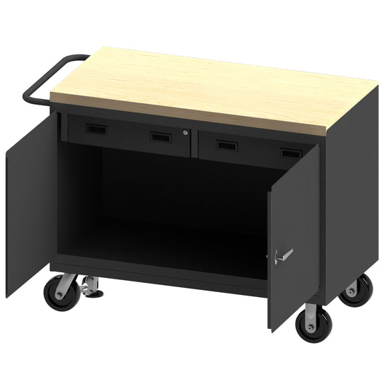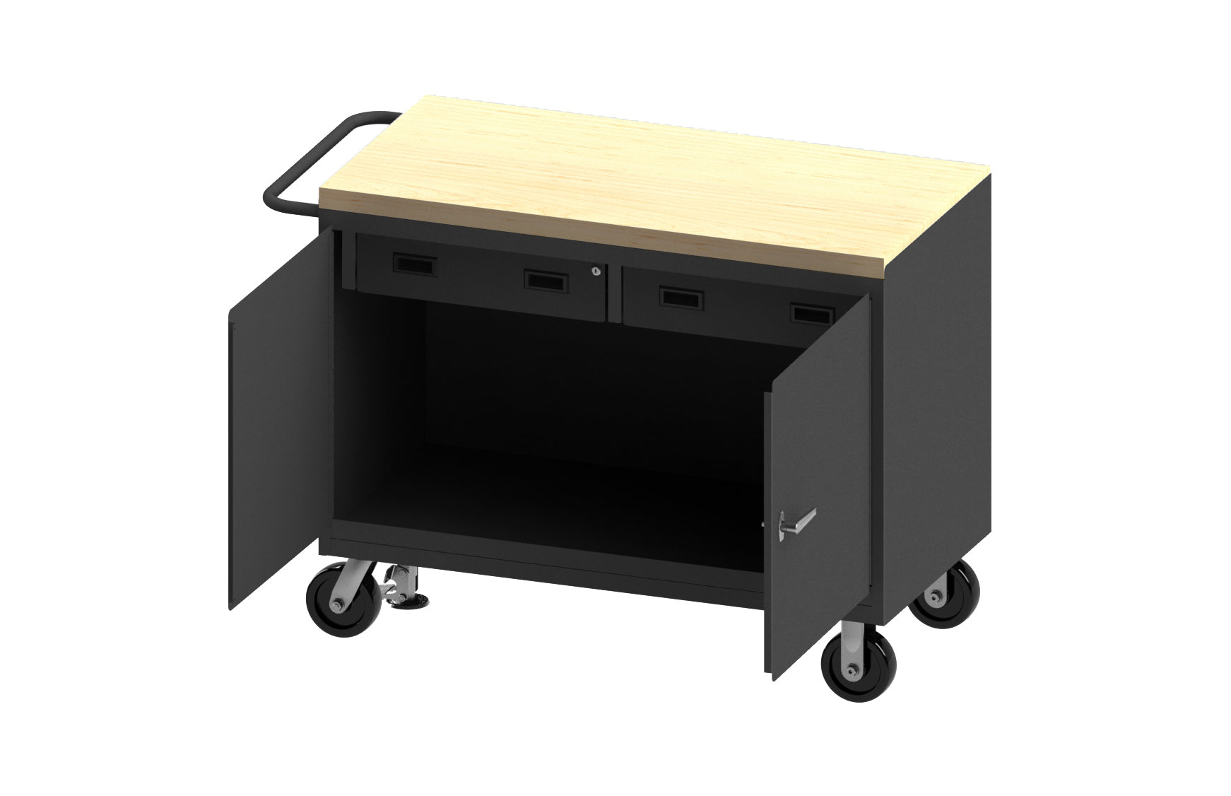 Mobile Bench Cabinet with 6" X 2" Phenolic Casters - (2) Rigid, (2) Swivel, 2 Doors, 2 Drawers, Maple Top Surface, Floor Lock, Tubular Push Handle, Gray