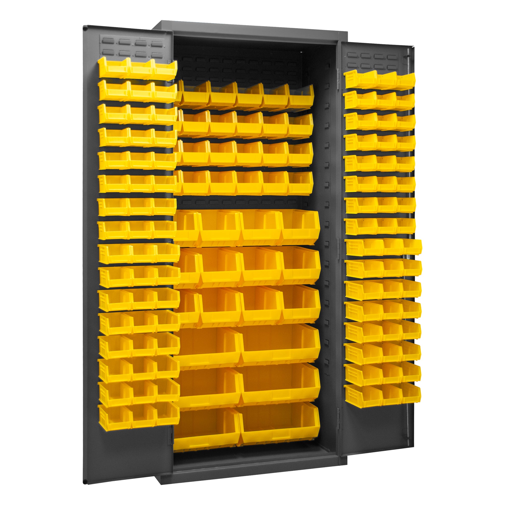 Heavy Duty Cabinet, 14 Gauge, 36 x 24 x 84, 138 Yellow Bins, Recessed Doors with Louvered Panel, Lockable, Chrome Handle with Keys, Gray
