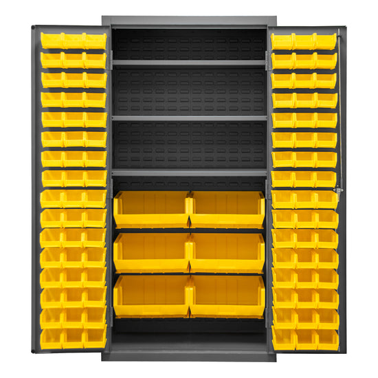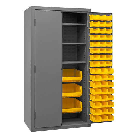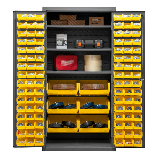 Heavy Duty Cabinet, 14 Gauge, 36 x 24 x 72, 3 Adjustable Shelves, 102 Yellow Bins, Recessed Doors with Louvered Panel, Lockable, Chrome Handle with Keys, Gray