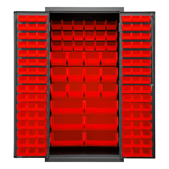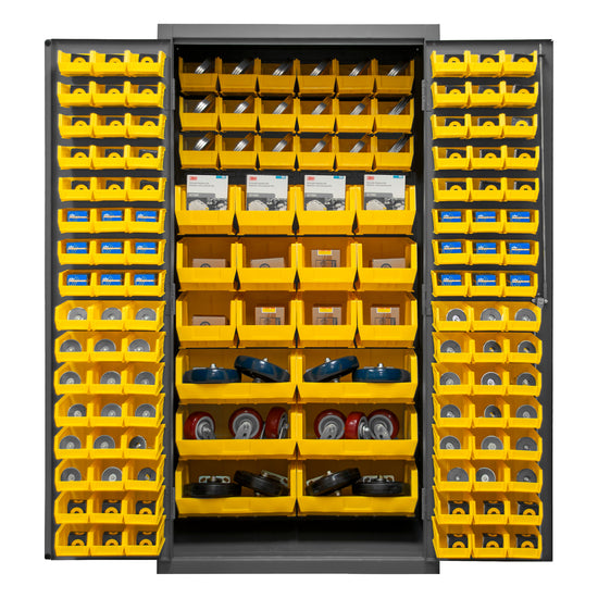 Heavy Duty Cabinet, 14 Gauge, 36 x 24 x 72, 132 Yellow Bins, Recessed Doors with Louvered Panel, Lockable, Chrome Handle with Keys, Gray