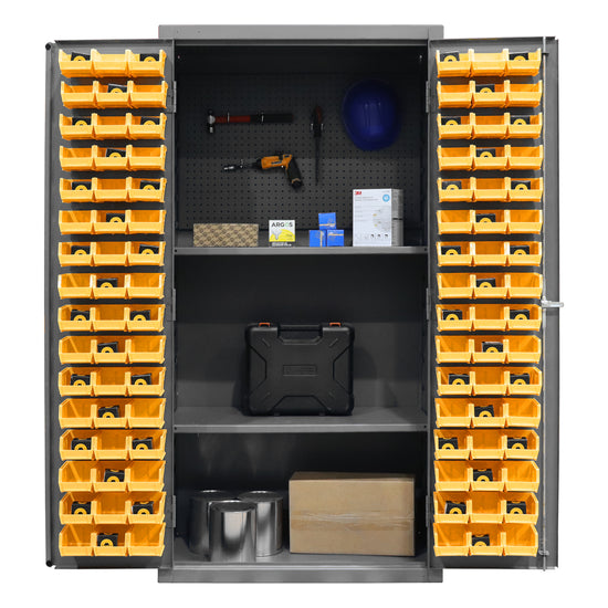 Heavy Duty Cabinet, 14 Gauge, 36 x 24 x 72, 2 Adjustable Shelves, 96 Yellow Bins, Pegboard Back, Recessed Doors with Louvered Panel, Lockable, Chrome Handle with Keys, Gray