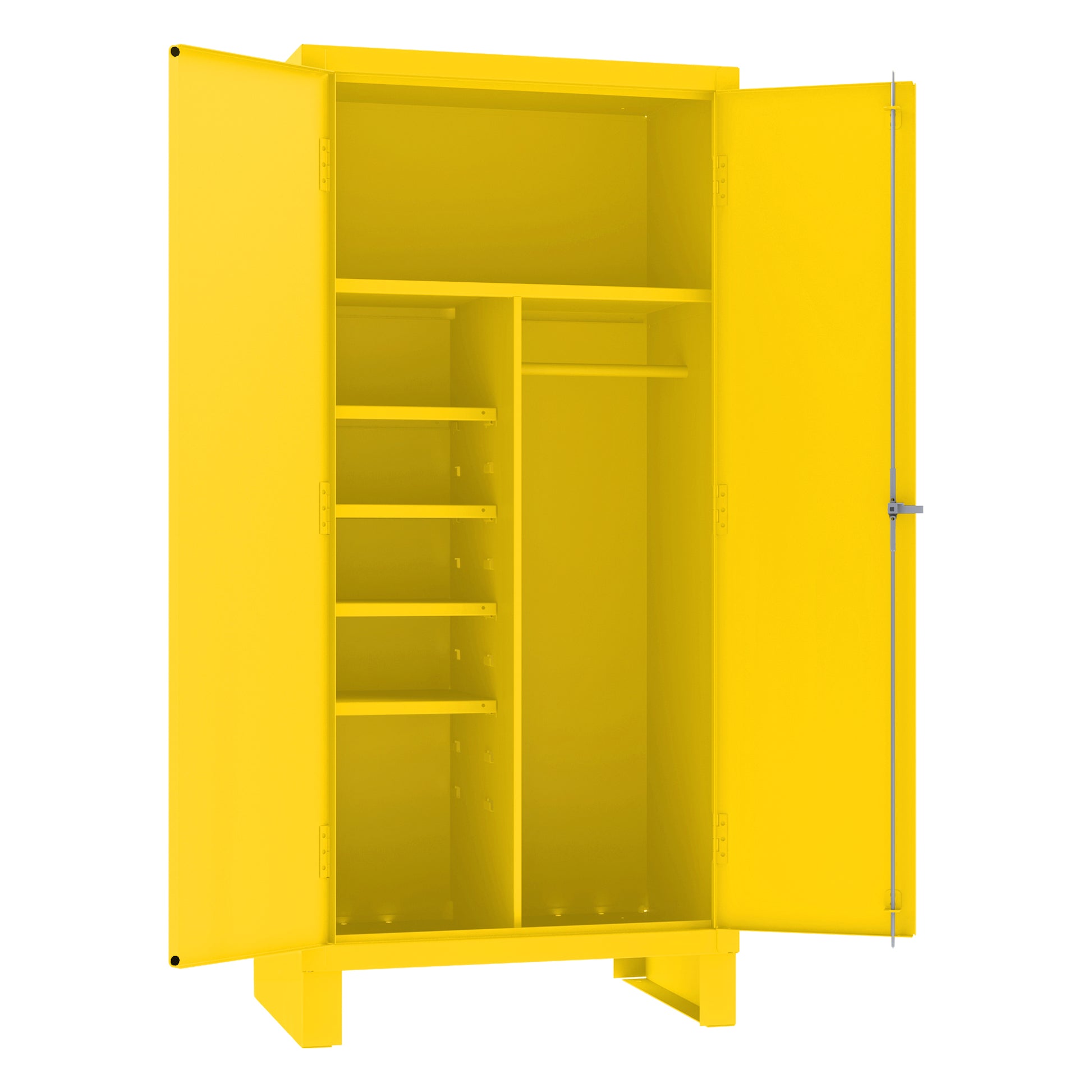Heavy Duty Spill Control Cabinet with Wardrobe/Broom Storage, Lockable, 1 Fixed Top Shelf, 4 Adjustable Side Shelves, Hanger Bar, Yellow