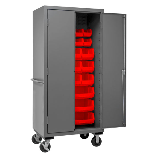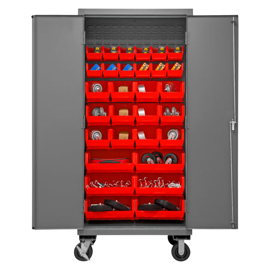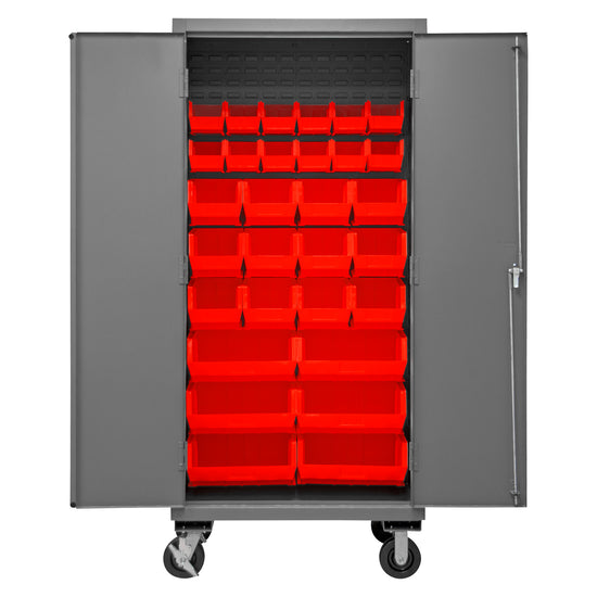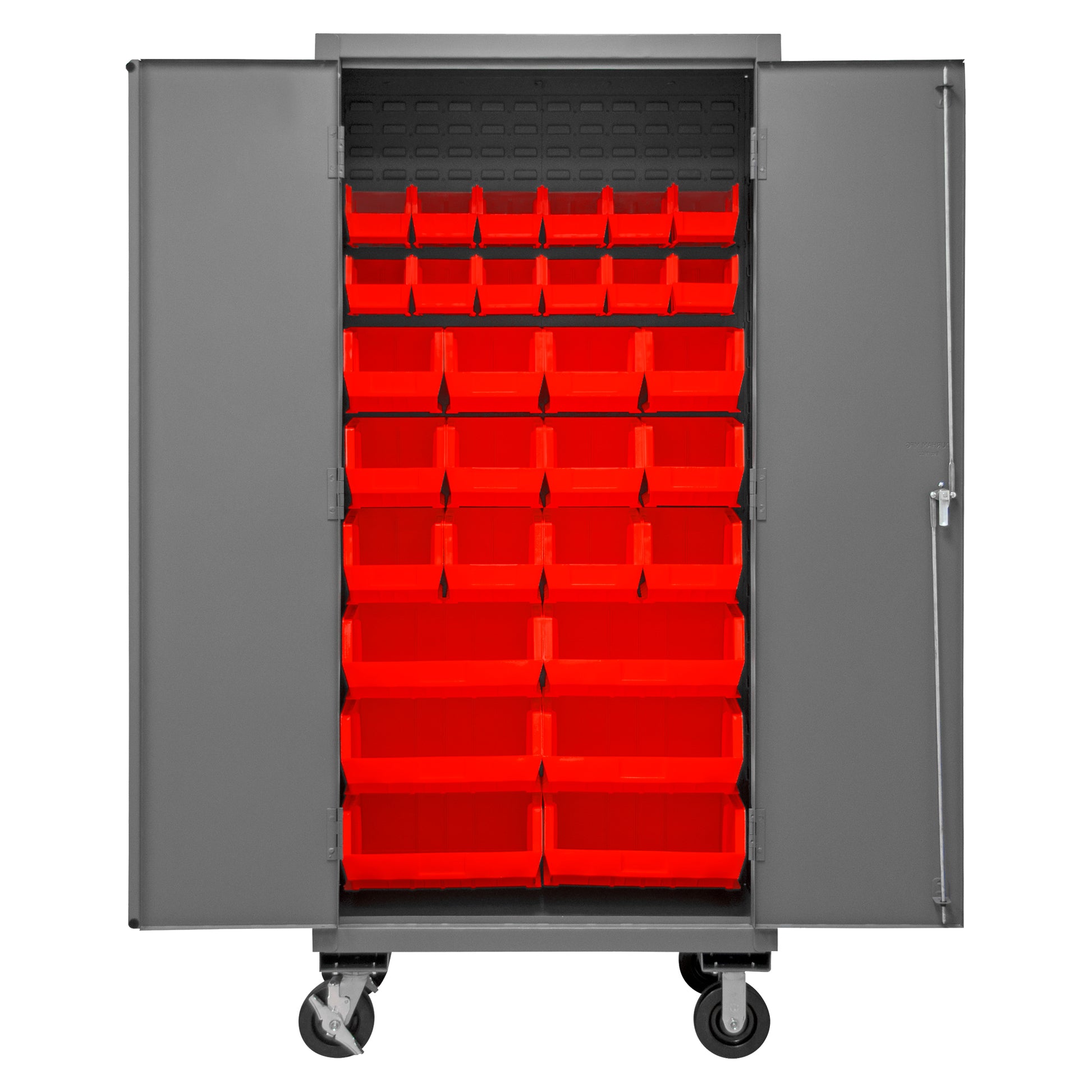 Mobile Cabinet, 14 Gauge, 36 x 24 x 81, 30 Red Bins, Recessed Doors, 6" x 2" Phenolic Casters - (2) Rigid, (2) Swivel, Lockable, Chrome Handle with Keys, Gray