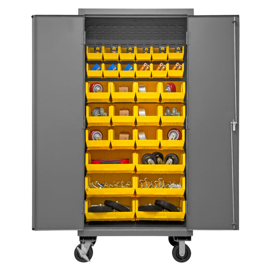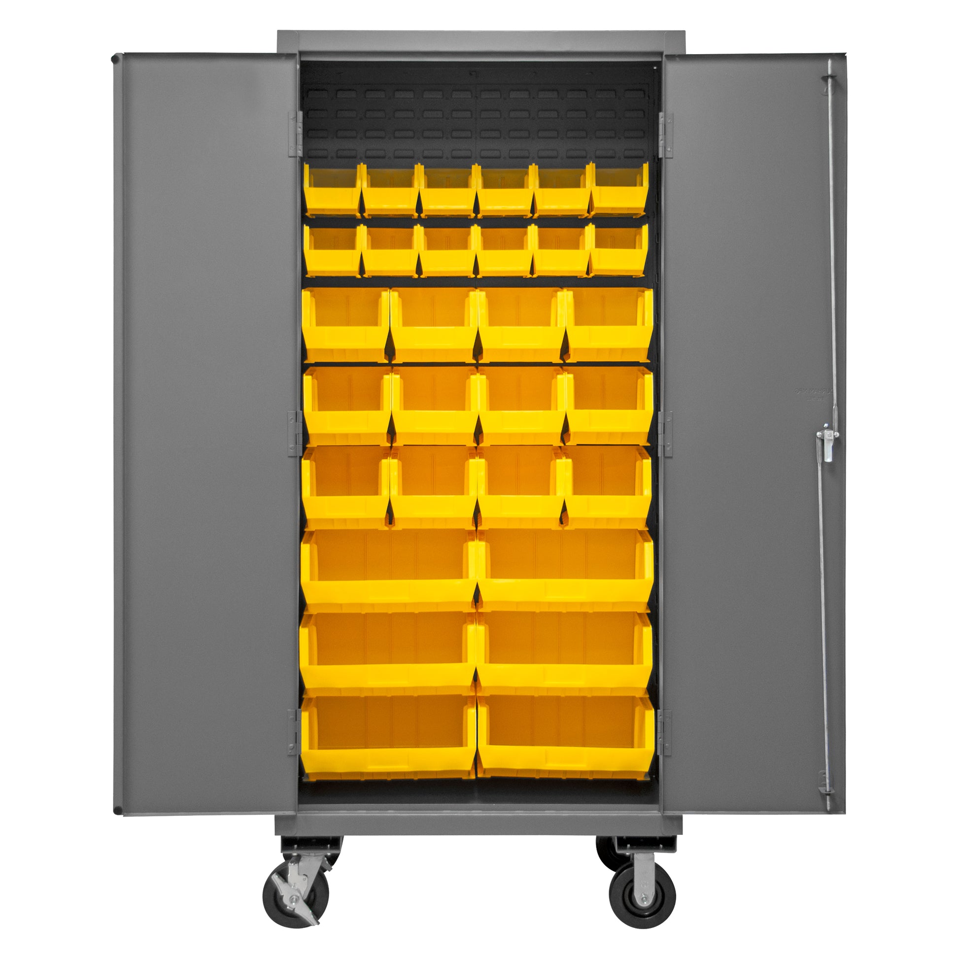 Mobile Cabinet, 14 Gauge, 36 x 24 x 81, 30 Yellow Bins, Recessed Doors, 6" x 2" Phenolic Casters - (2) Rigid, (2) Swivel, Lockable, Chrome Handle with Keys, Gray