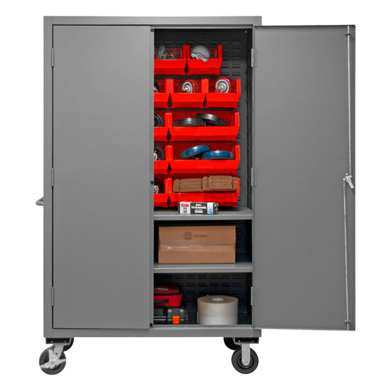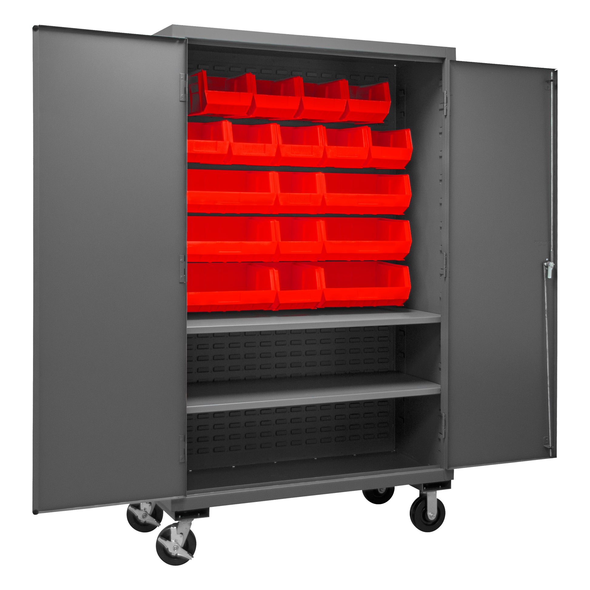 Mobile Cabinet, 14 Gauge, 48 x 24 x 81, 2 Adjustable Shelves, 18 Red Bins, Recessed Doors, 6" x 2" Phenolic Casters - (2) Rigid, (2) Swivel, Lockable, Chrome Handle with Keys, Gray