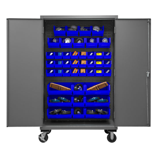 Mobile Cabinet, 14 Gauge, 48 x 24 x 81, 42 Blue Bins, Recessed Doors, 6" x 2" Phenolic Casters - (2) Rigid, (2) Swivel, Lockable, Chrome Handle with Keys, Gray