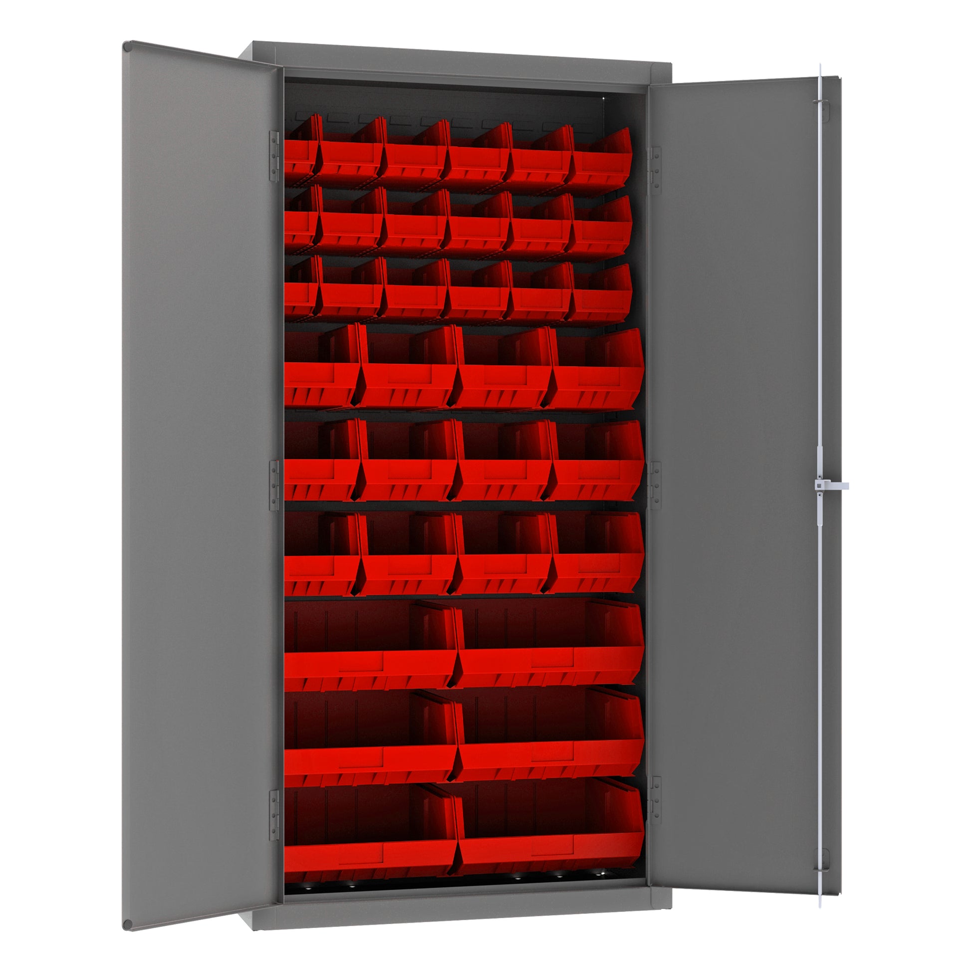 Heavy Duty Cabinet, 14 Gauge, 36 x 18 x 72, 36 Red Bins, Flush Doors, Lockable, Chrome Handle with Keys, Gray