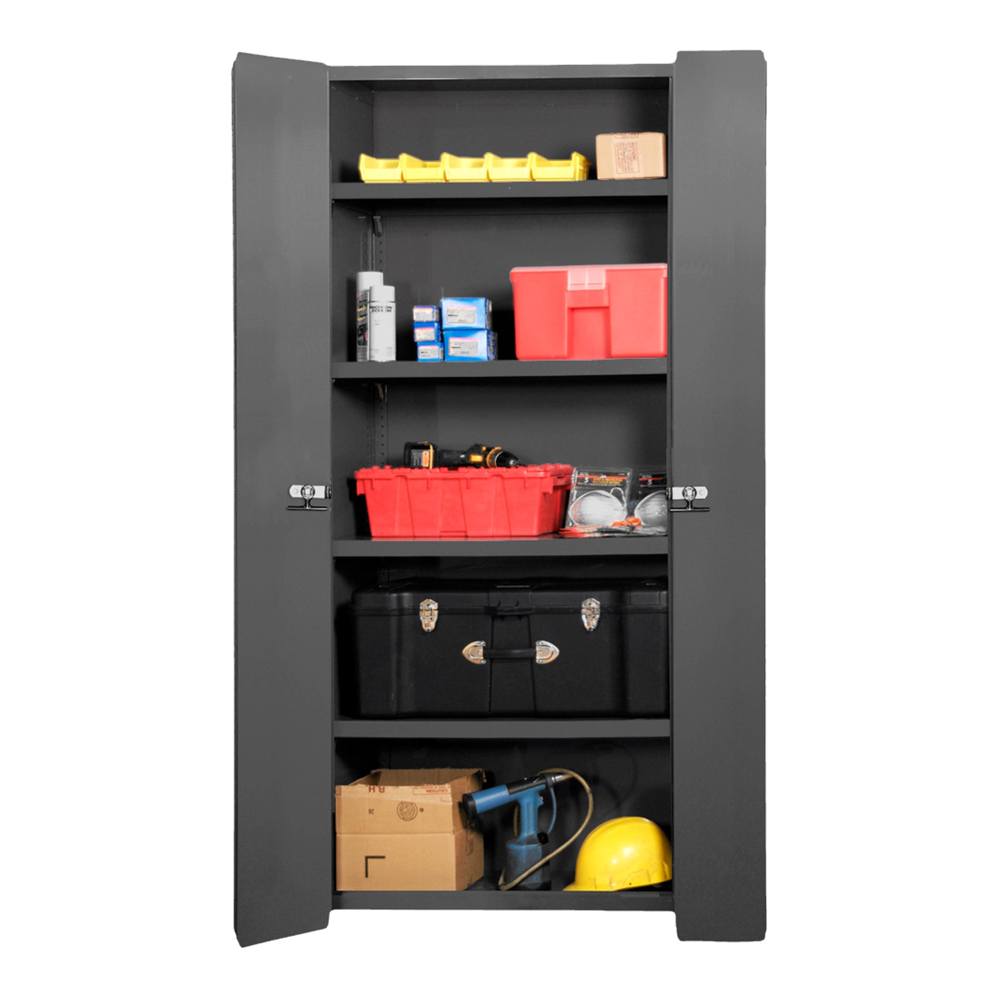 Space Saving Cabinet, 14 Gauge, 36 x 24 x 84, 4 Adjustable Shelves, Bi-Fold, Flush Doors, Fold Down Pad-lockable Handle, Gray