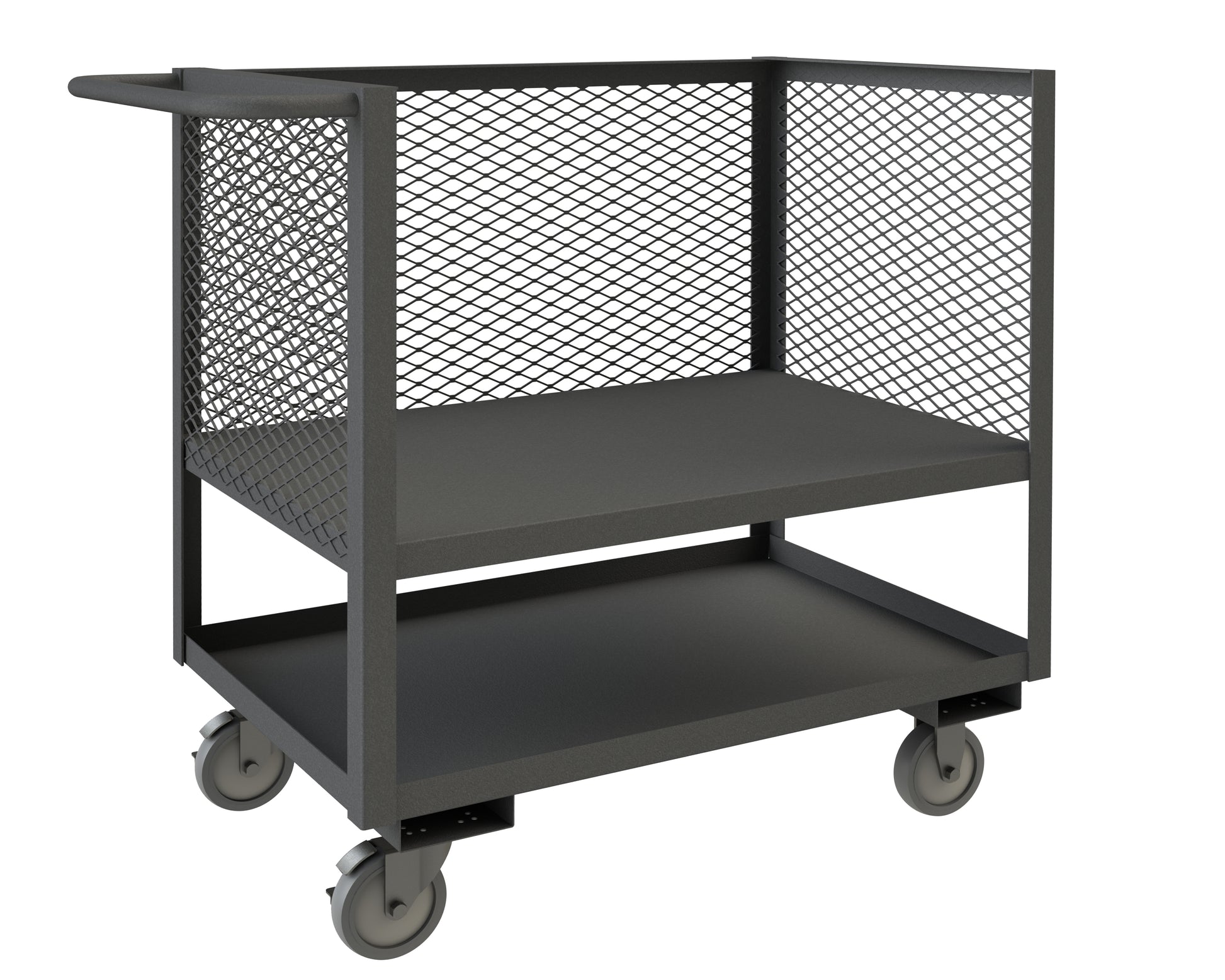 3 Sided Mesh Truck with 5" x 1-1/4" Polyurethane Casters - (2) Rigid, (2) Swivel, 2 Shelves, Bottom Shelf 1-1/2" Lips Up, Tubular Push Handle, Gray