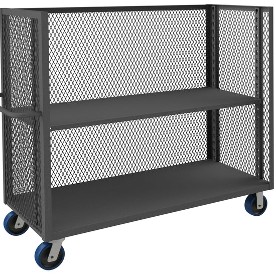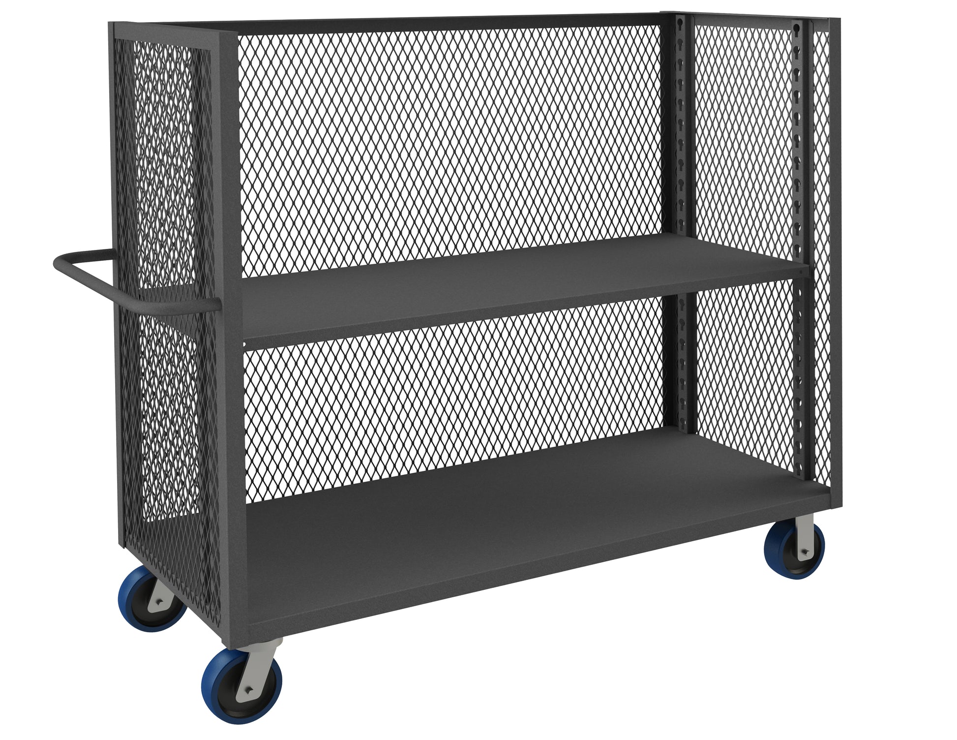 3 Sided Mesh Truck with 6" x 2" Polyurethane Casters - (2) Rigid, (2) Swivel, 2 Shelves, 1 Adjustable, Tubular Push Handle, Gray