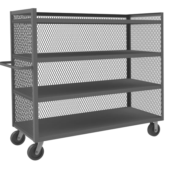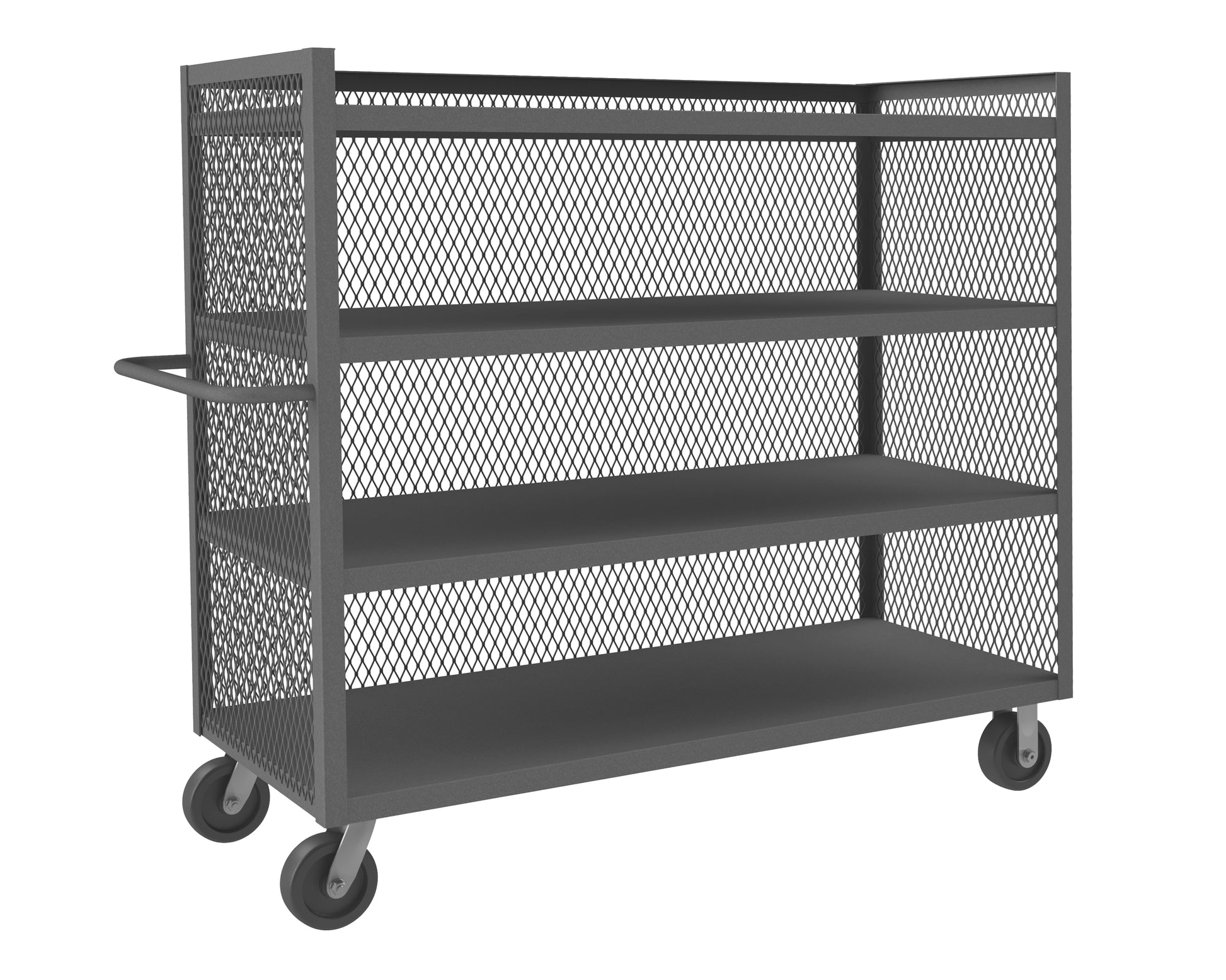 3 Sided Mesh Truck with 6" x 2" Phenolic Casters - (2) Rigid, (2) Swivel, 3 Fixed Shelves, 1 Base Shelf, Tubular Push Handle, Gray