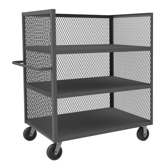 3 Sided Mesh Truck with 6" x 2" Phenolic Casters - (2) Rigid, (2) Swivel, 2 Fixed Shelves, 1 Base Shelf, Tubular Push Handle, Gray