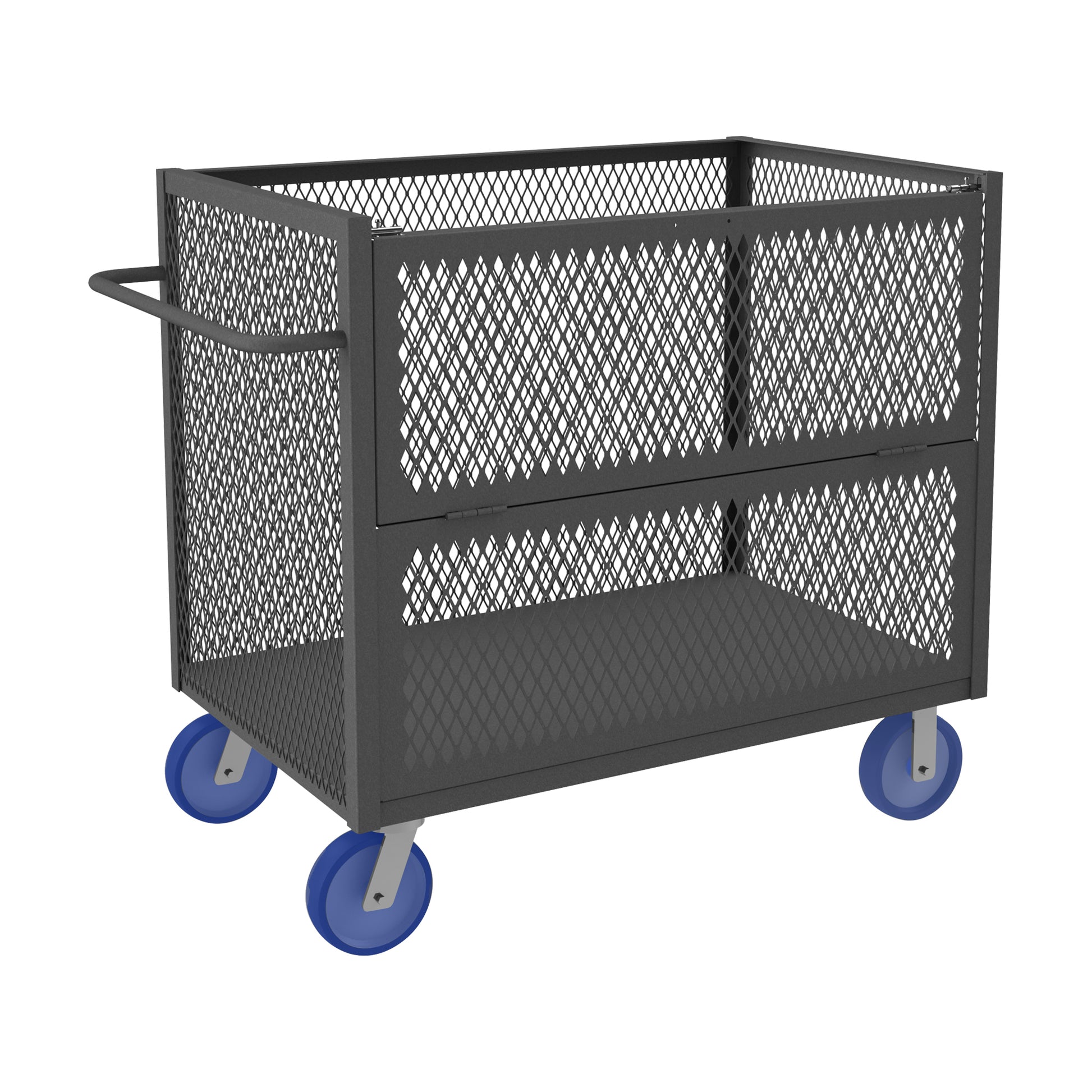 3 Sided Mesh Truck with 8" x 2" Polyurethane Casters - (2) Rigid, (2) Swivel, 1 Shelf, Tubular Push Handle, Drop Gate, Gray