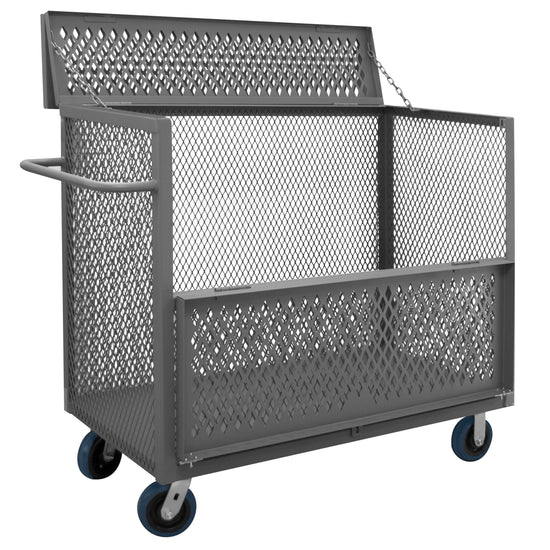 3 Sided Mesh Truck with 6" x 2" Polyurethane Casters - (2) Rigid, (2) Swivel, 1 Shelf, Tubular Push Handle, Drop Gate and Cover, Gray
