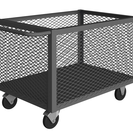 4 Sided Mesh Box Truck with 5" x 1-1/4" Polyolefin Casters - (2) Rigid, (2) Swivel with Side Brakes, 1 Shelf, Tubular Push Handle, Gray