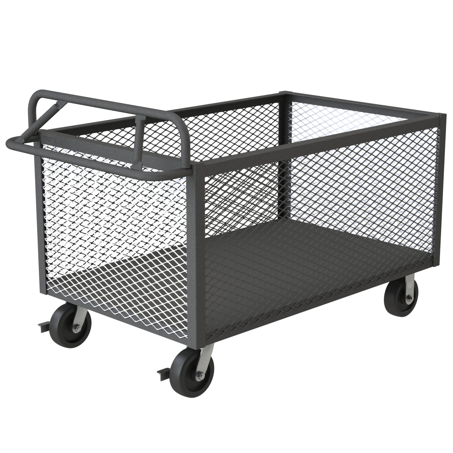 4 Sided Mesh Box Truck with 6" x 2" Phenolic Casters - (2) Rigid, (2) Swivel with Side Brakes, 1 Shelf, Ergonomic Tubular Push Handle, Gray