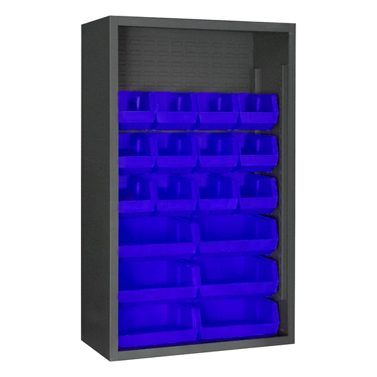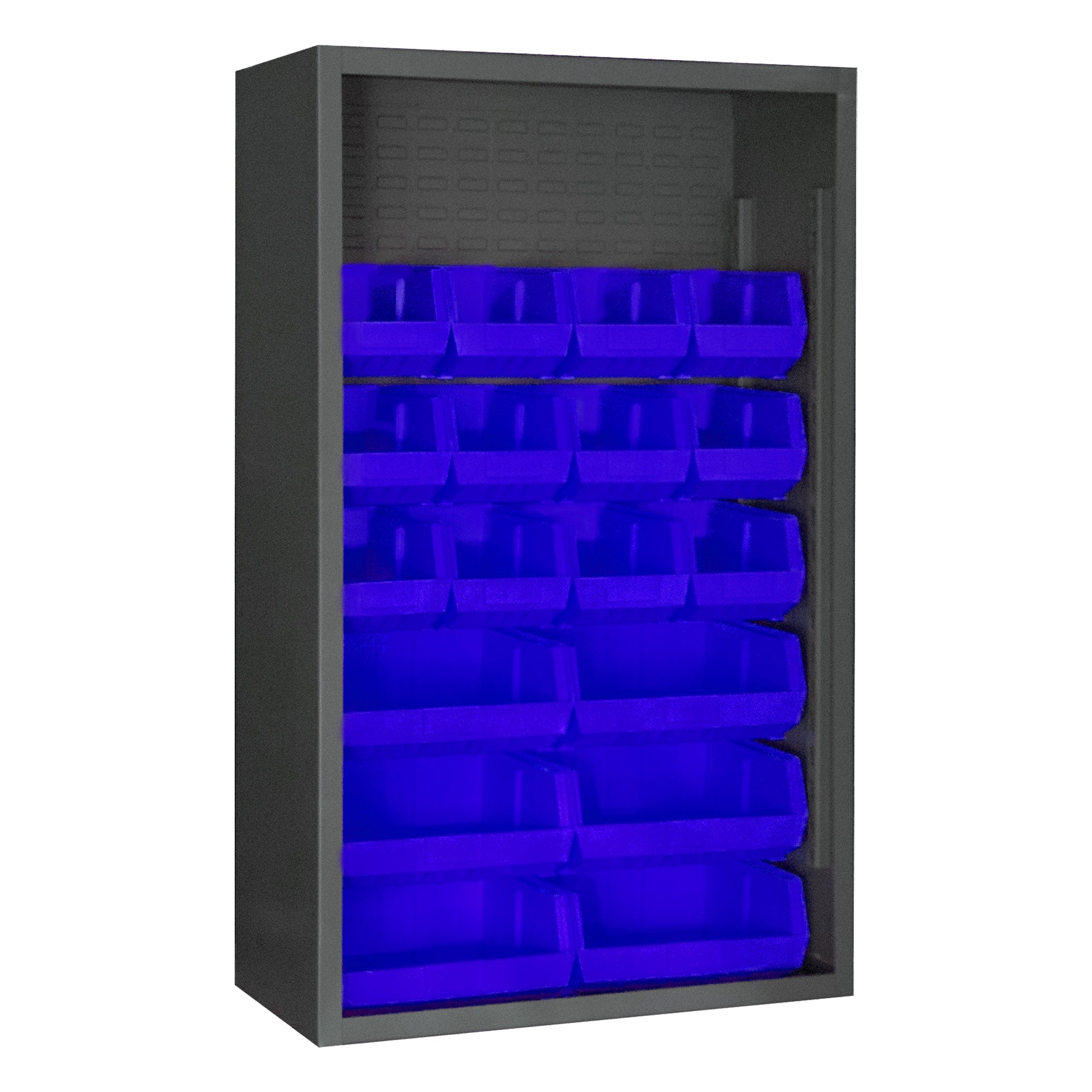 Enclosed Shelving, 12 Gauge, 36 x 18 x 60, 18 Blue Bins, Gray