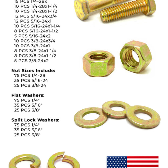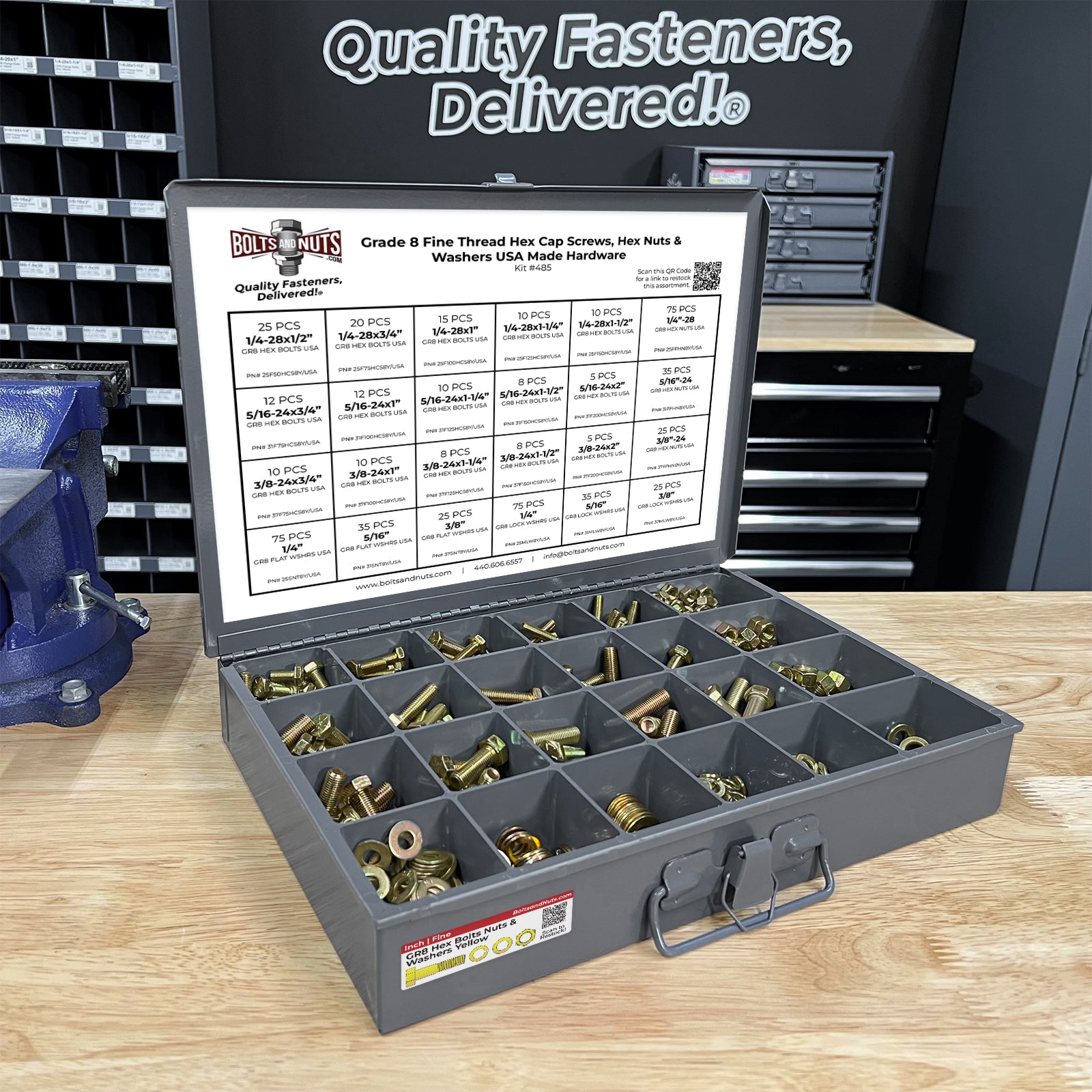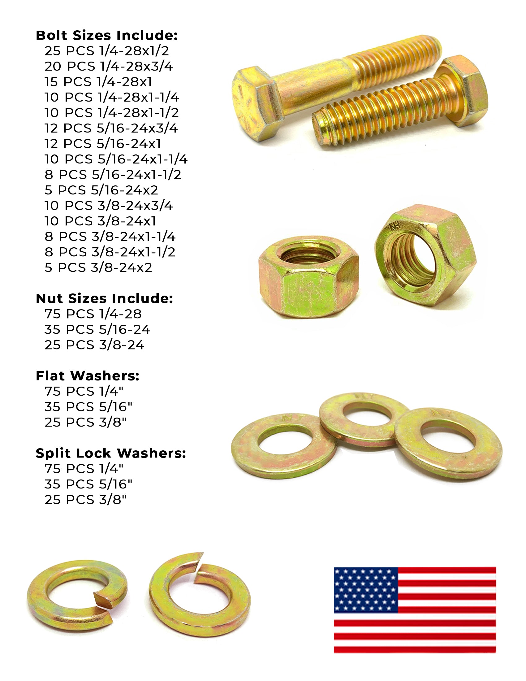Inch Grade 8 Fine Thread Hex Cap Screws, Hex Nuts & Washers Zinc Yellow USA Made Hardware - 574 PCS