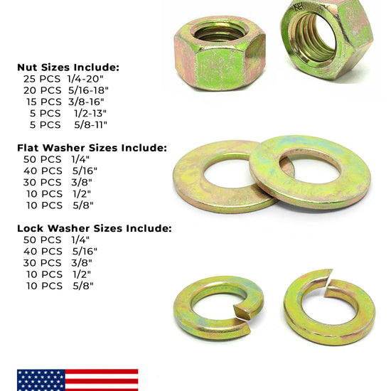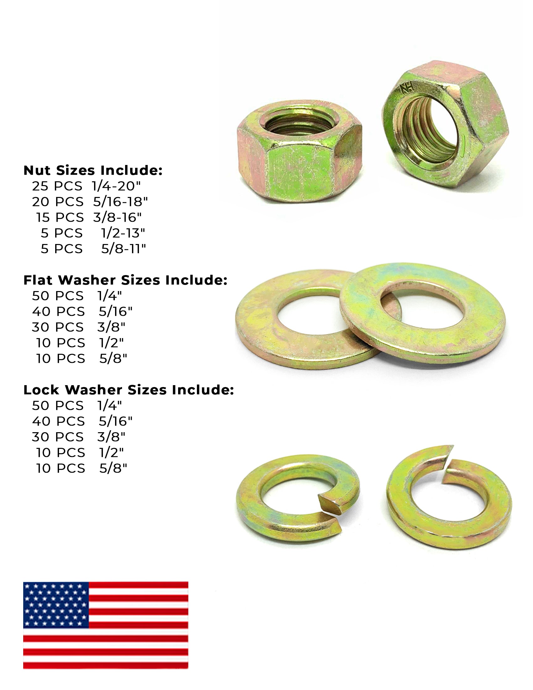 Inch Grade 8 Finished Hex Nuts, SAE Flat & Split Lock Washers USA Made Hardware Assortment - 351 Pcs