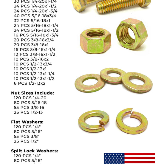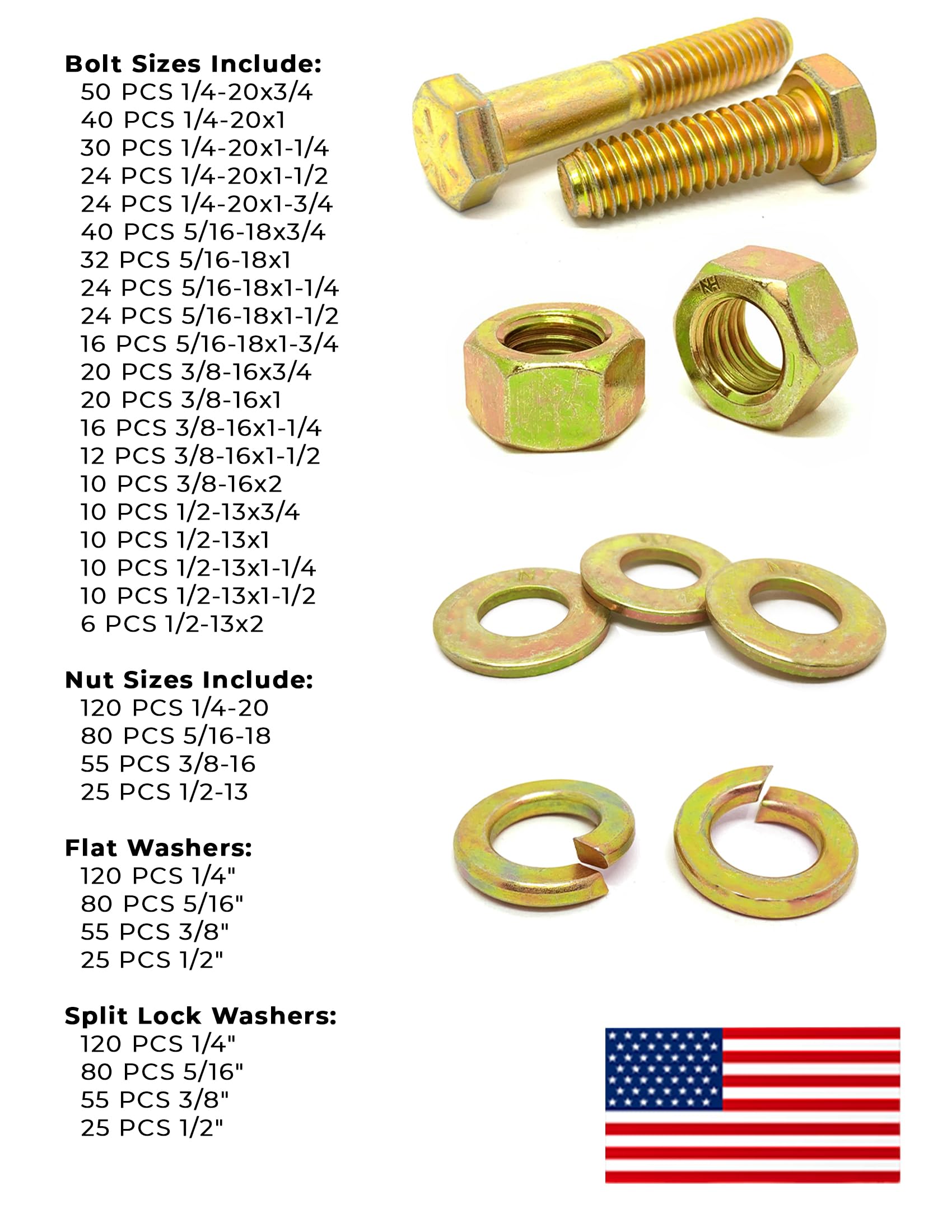 Inch Grade 8 Hex Cap Screws, Hex Nuts, Flat & Lock Washers Coarse Thread Zinc Yellow USA Made Hardware - 1268 PCS