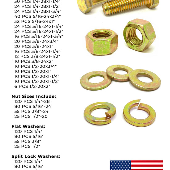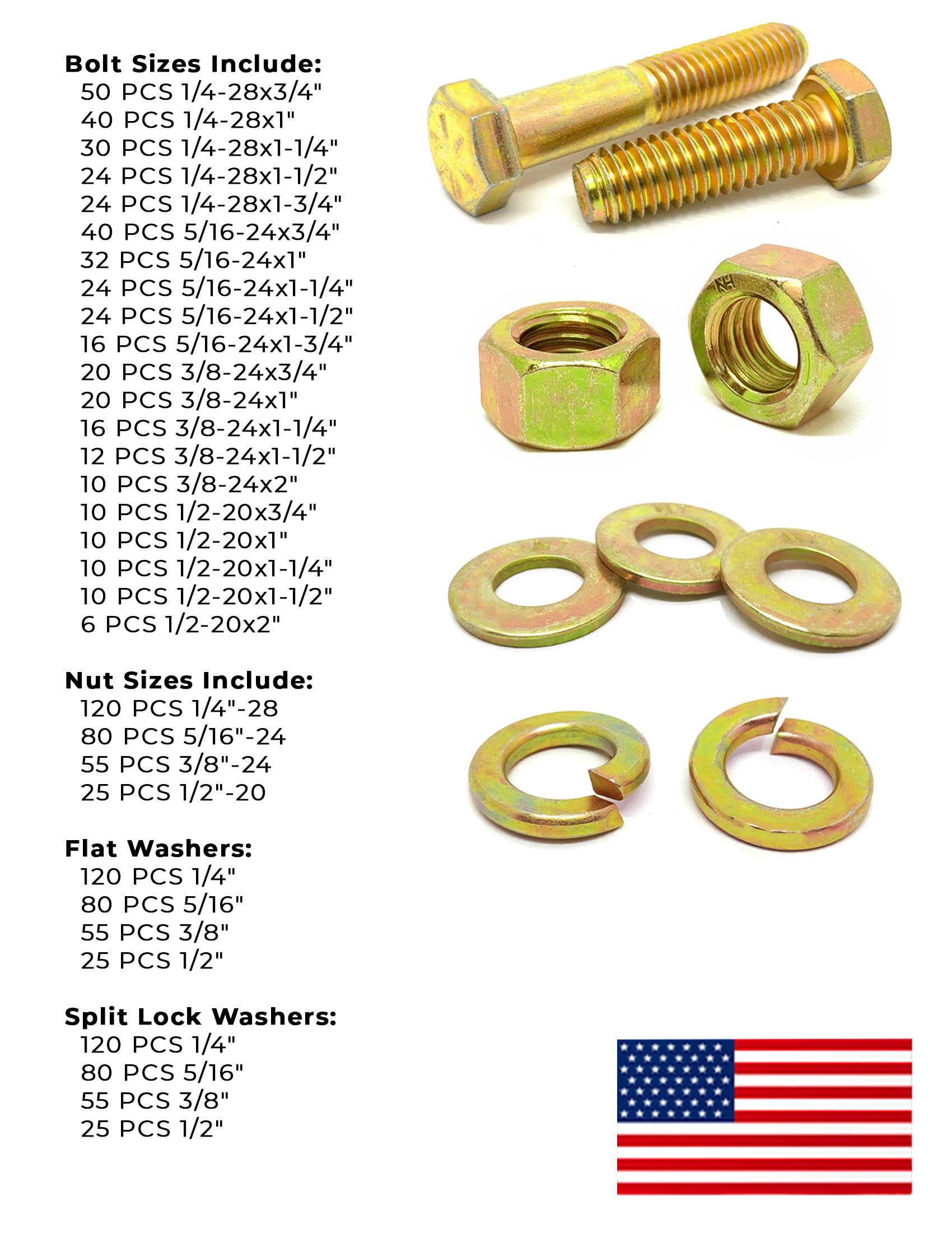 Inch Grade 8 Hex Cap Screws, Hex Nuts, Flat & Lock Washers Fine Thread Zinc Yellow USA Made Hardware - 1268 PCS