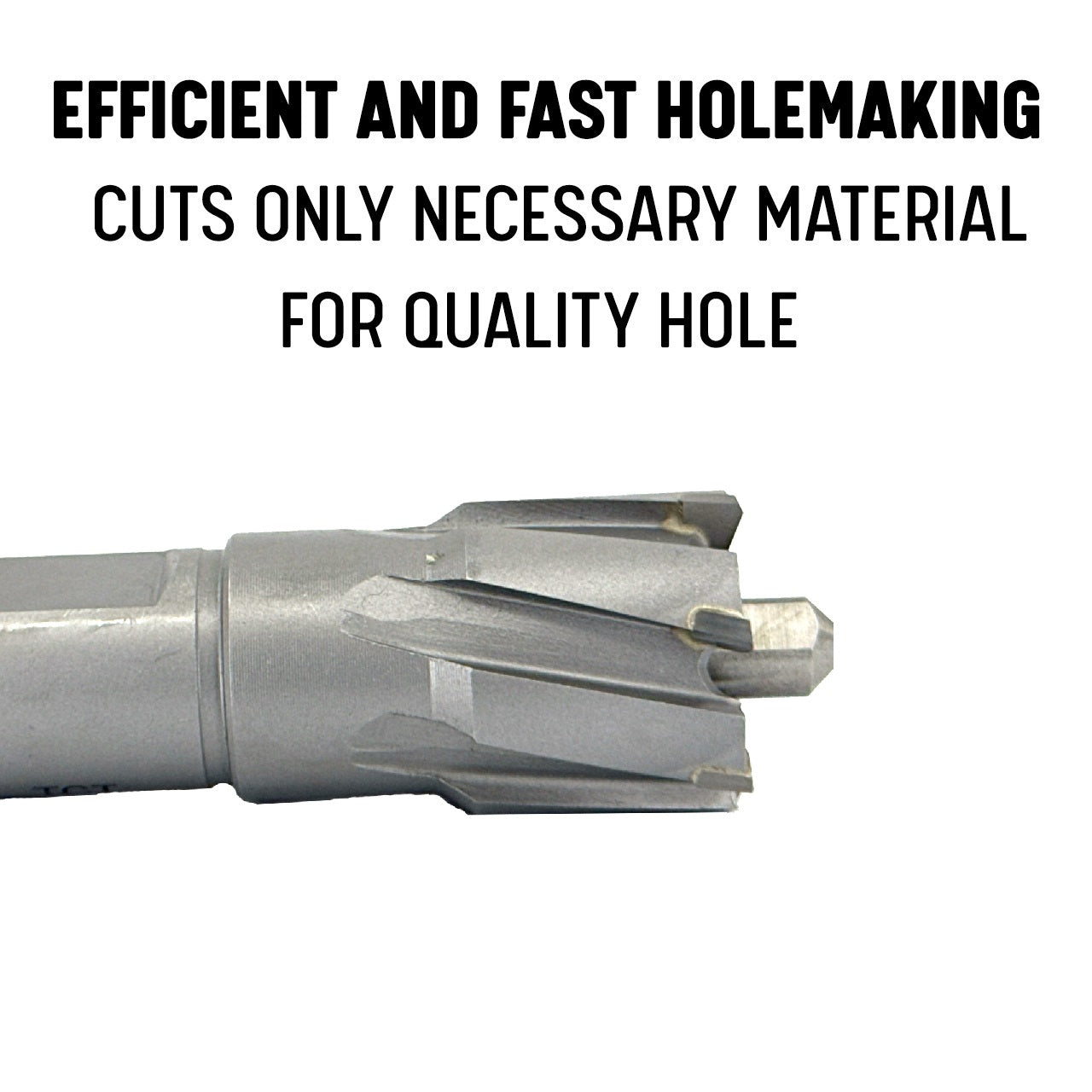 Drill America Carbide Tipped Annular Cutters are designed for fast, efficient hole making and cut only that material necessary to produce a quality hole. The carbide tips allows for fast drilling of larger diameter holes with longer life and the ability to perform in more abrasive and harder materials than high speed cutters. Sometimes called mag drills or magnetic drill bits, Drill America Annular cutters have a 3/4" Weldon Shank for use with magnetic drill press only. Do not use this cutter with a standard hand drill or drill press. Pilot pin included.