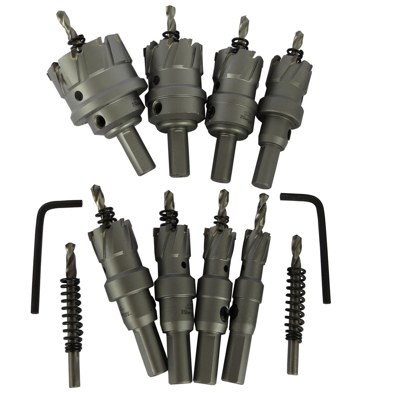Carbide Tipped Hole Cutters offer an easy and efficient way to drill larger diameter holes without requiring large drill bits and extra large chucks. They are good for cutting stainless steel, cast iron, iron, sheet metal and copper and also works well with abrasive materials like high density resin and metal plates. They are manufactured from premium grade high speed steel with carbide tipped teeth for extra long lifespan. They have an auto ejecting slug and can cut over 300 holes in stainless steel plate. Each cutter comes with Pilot Drill and Hex Key.