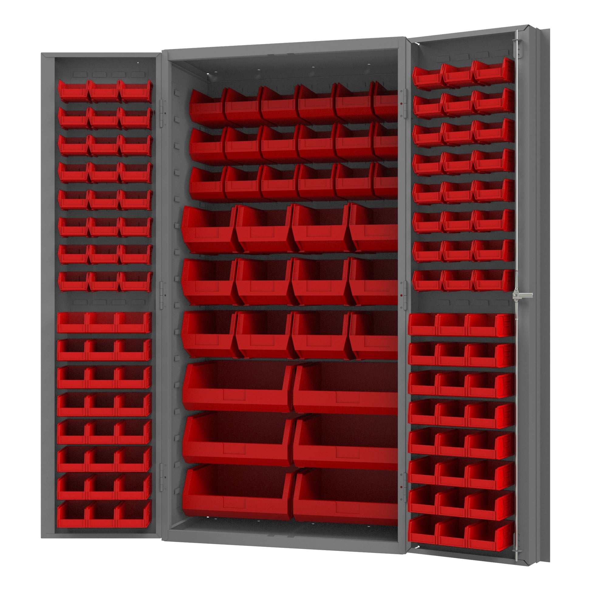 Heavy Duty Cabinet, 14 Gauge, 36 x 24 x 72, 132 Red Bins, 4" Deep Box Doors with Louvered Panel, Lockable, Chrome Handle with Keys, Gray